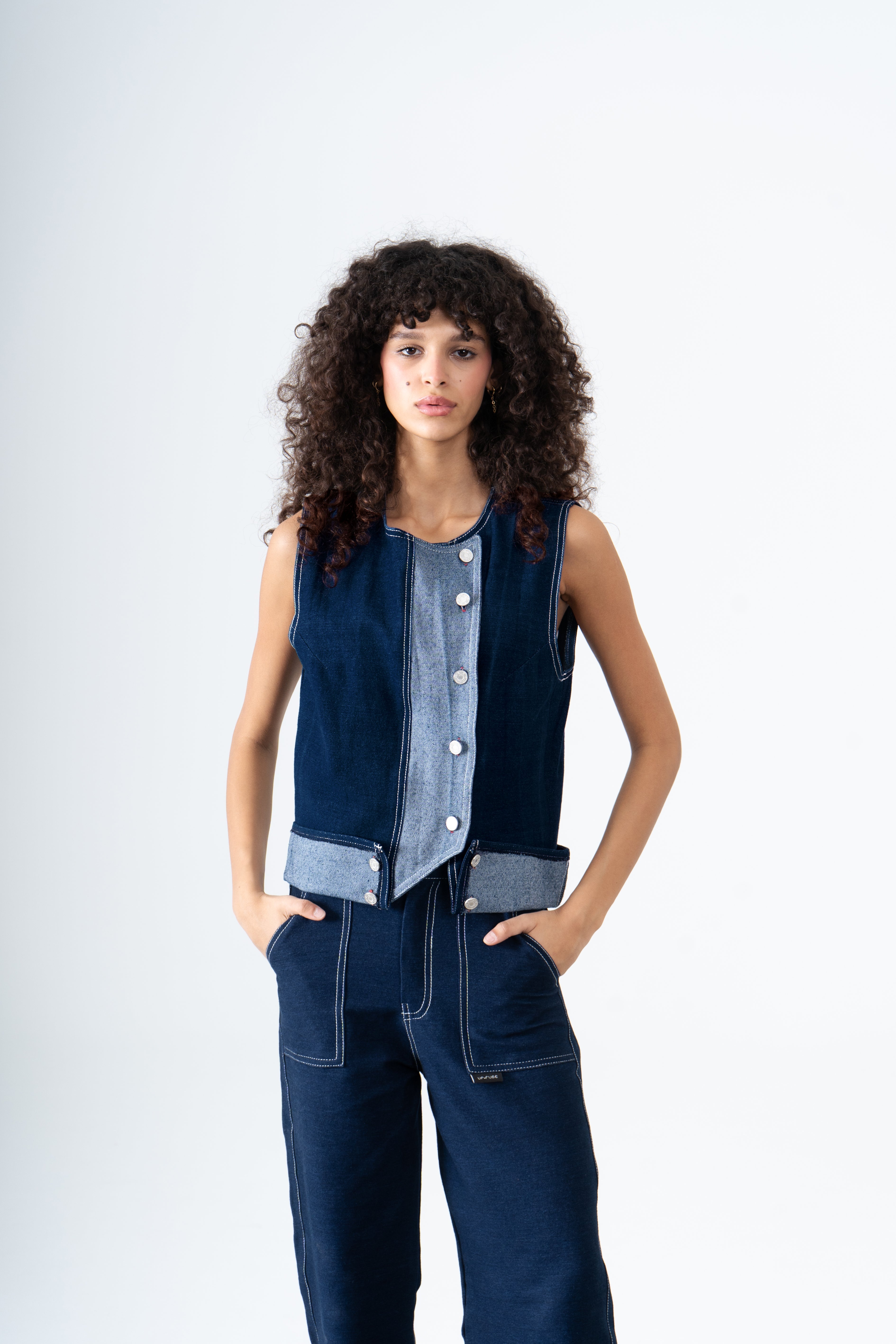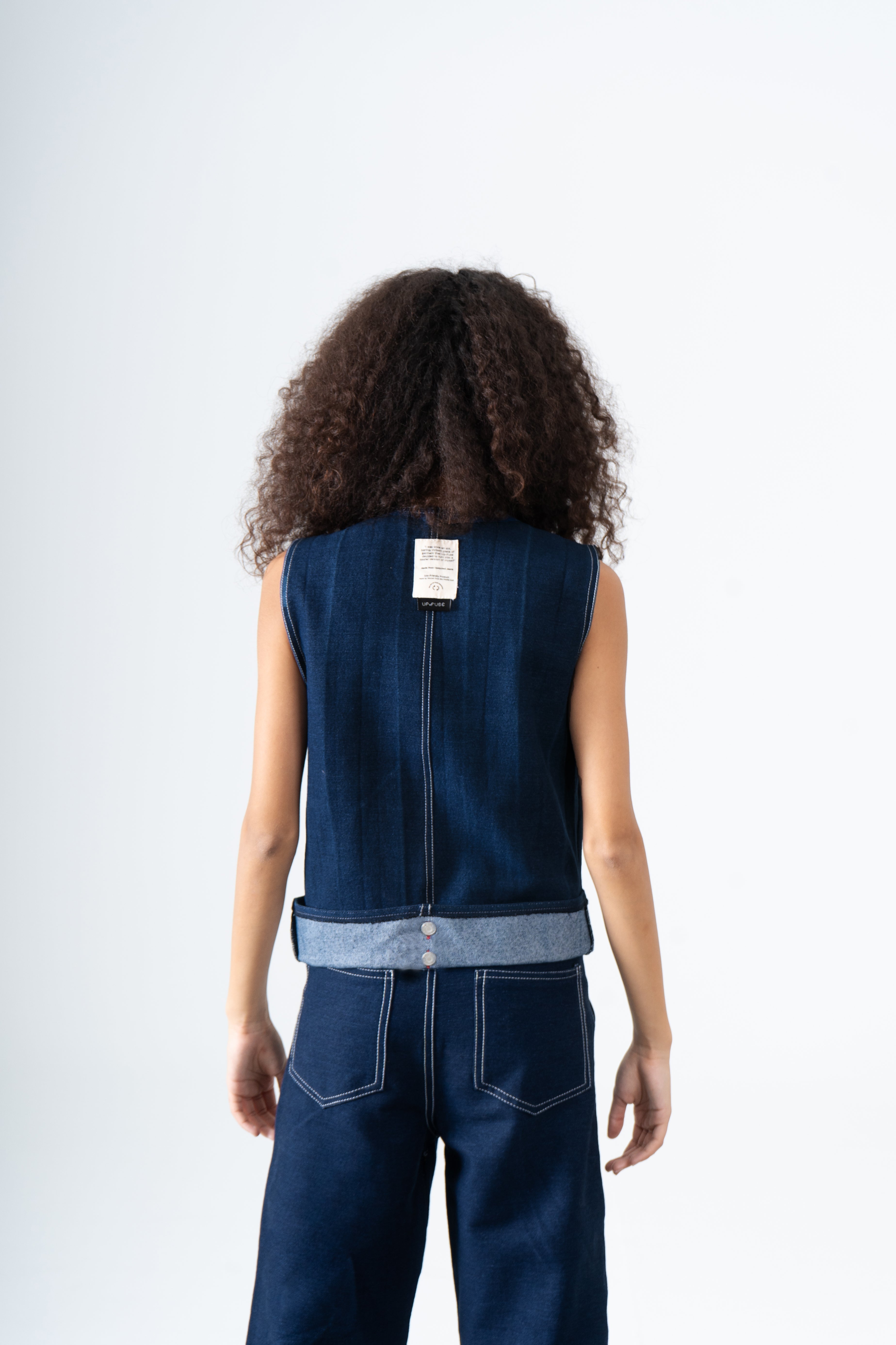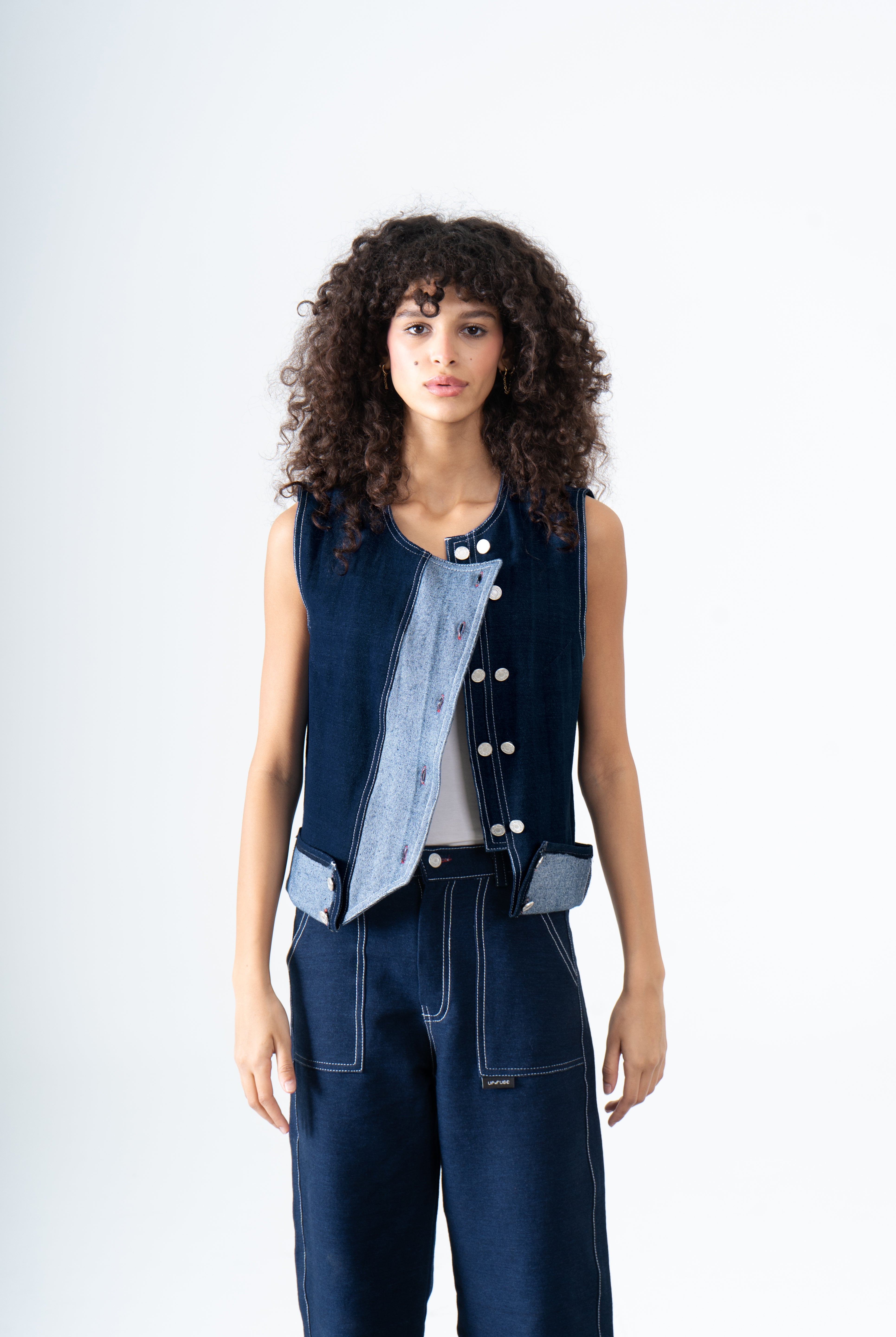 Embrace the art of modern tailoring with the Asymmetric Denim Vest in Black. This refined yet daring piece captures the perfect balance of timeless craftsmanship and contemporary design. The bold asymmetric silhouette and meticulously constructed raw-edge detailing create an effortlessly chic aesthetic that defies convention. Expertly crafted from upcycled denim, this vest offers a structured yet fluid fit that drapes beautifully, allowing it to transition from day to night with ease.