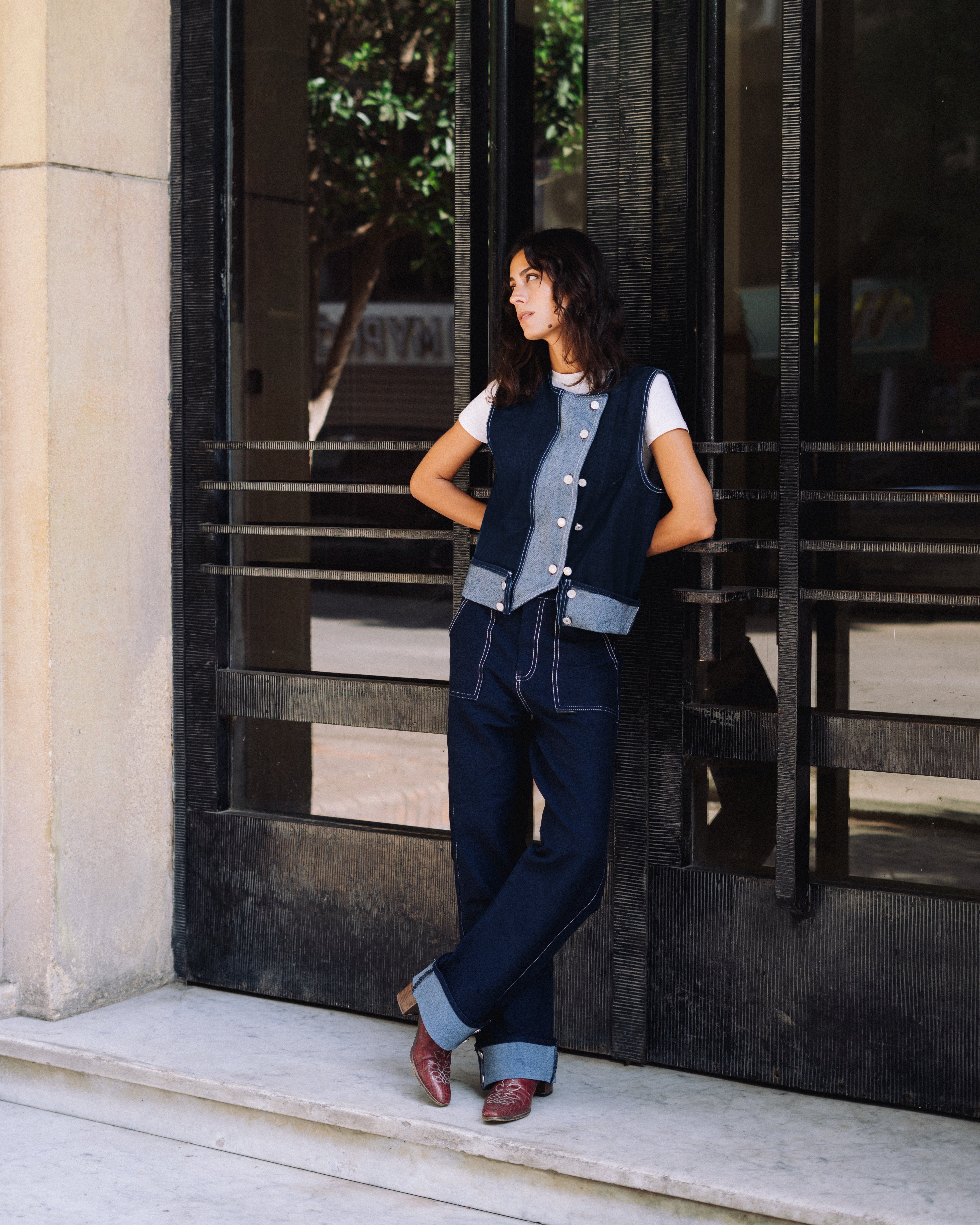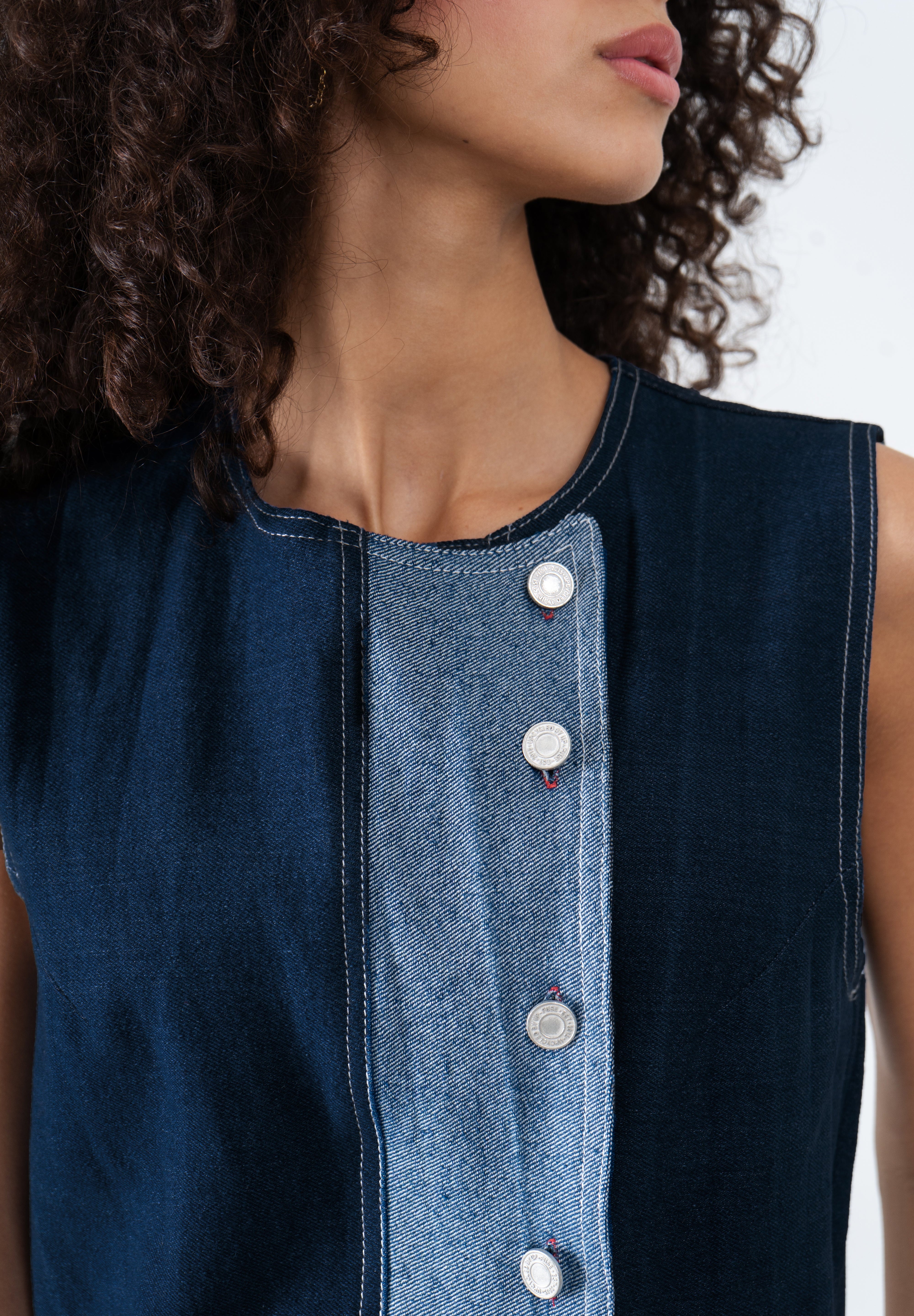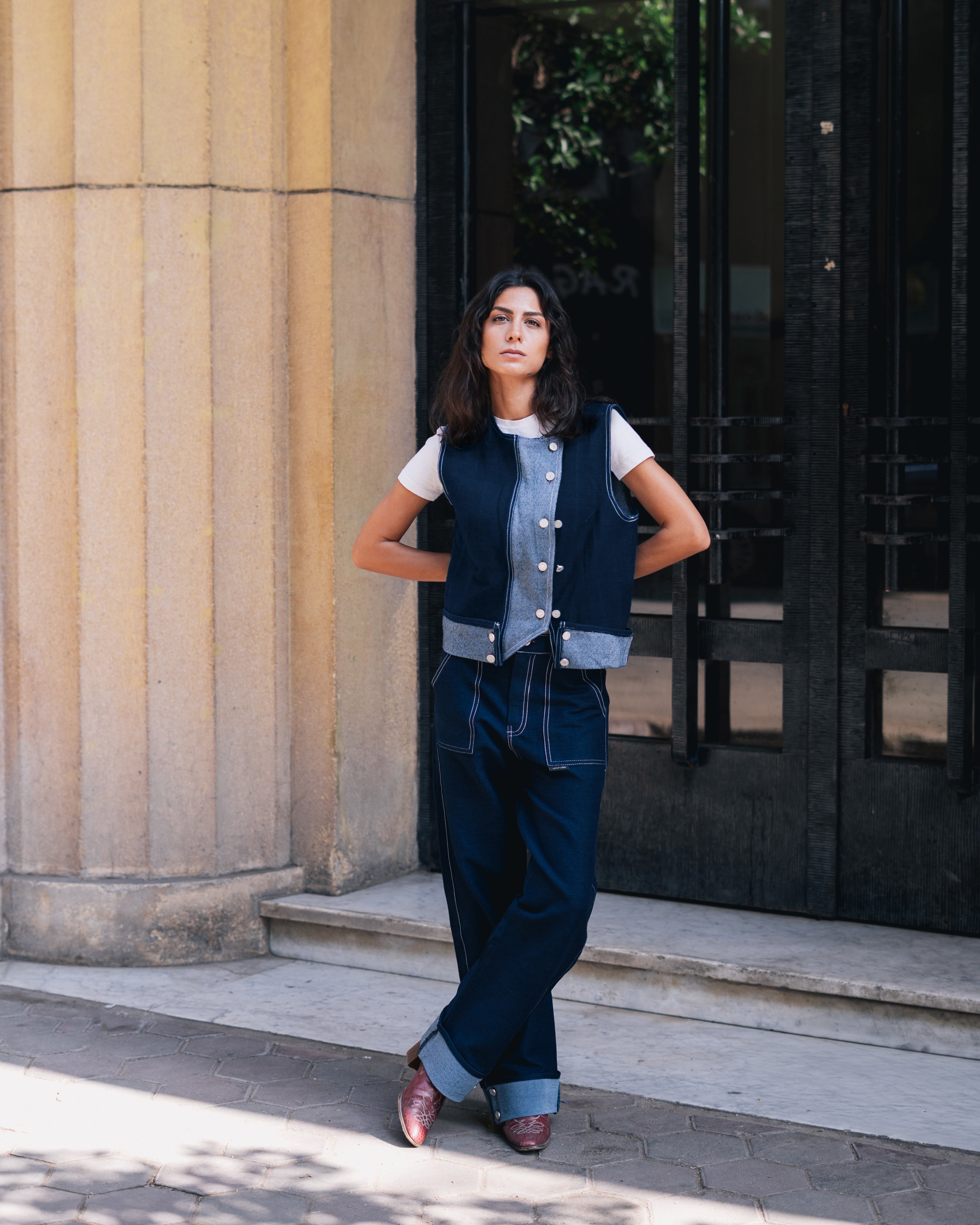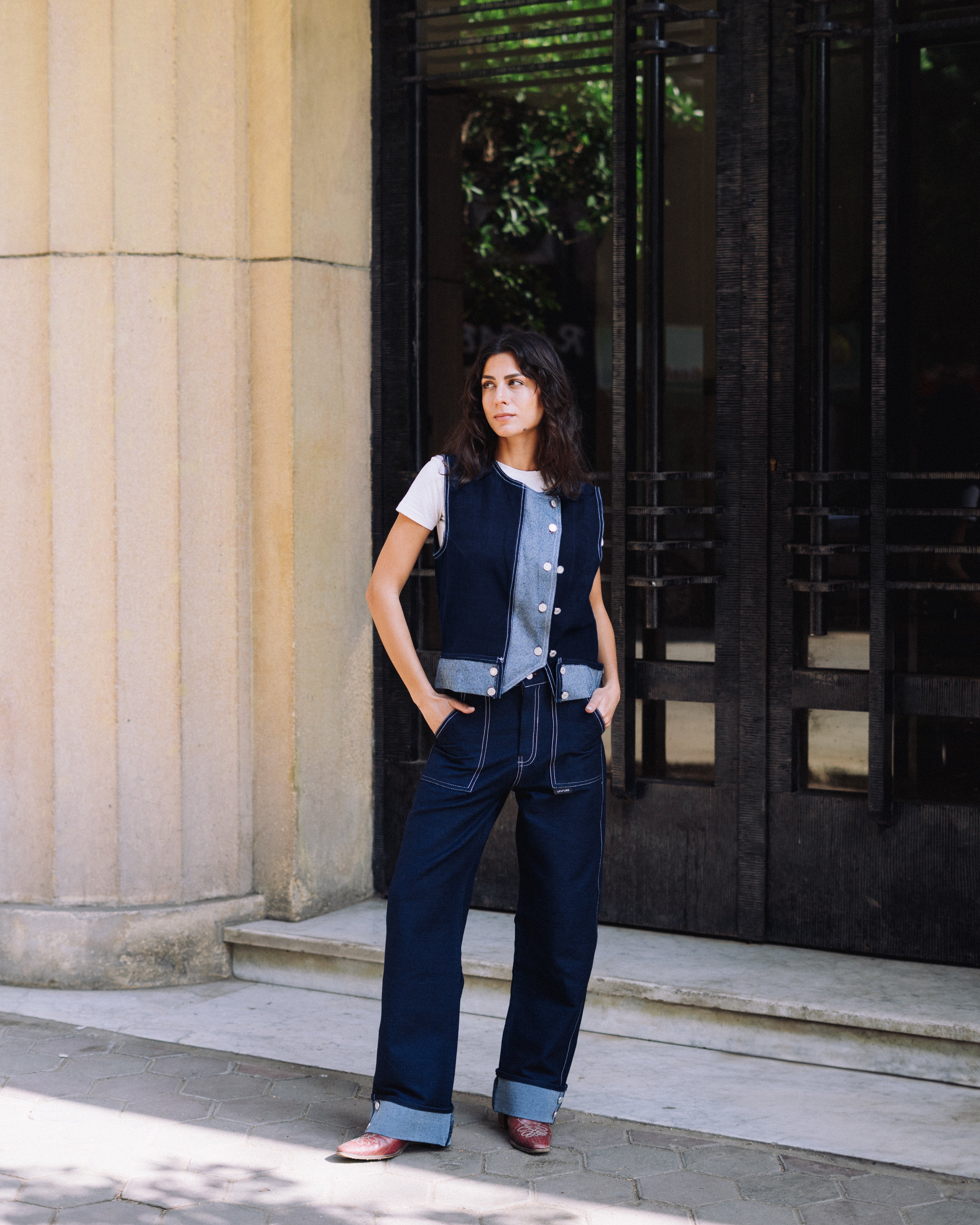 Embrace the art of modern tailoring with the Asymmetric Denim Vest in Black. This refined yet daring piece captures the perfect balance of timeless craftsmanship and contemporary design. The bold asymmetric silhouette and meticulously constructed raw-edge detailing create an effortlessly chic aesthetic that defies convention. Expertly crafted from upcycled denim, this vest offers a structured yet fluid fit that drapes beautifully, allowing it to transition from day to night with ease.