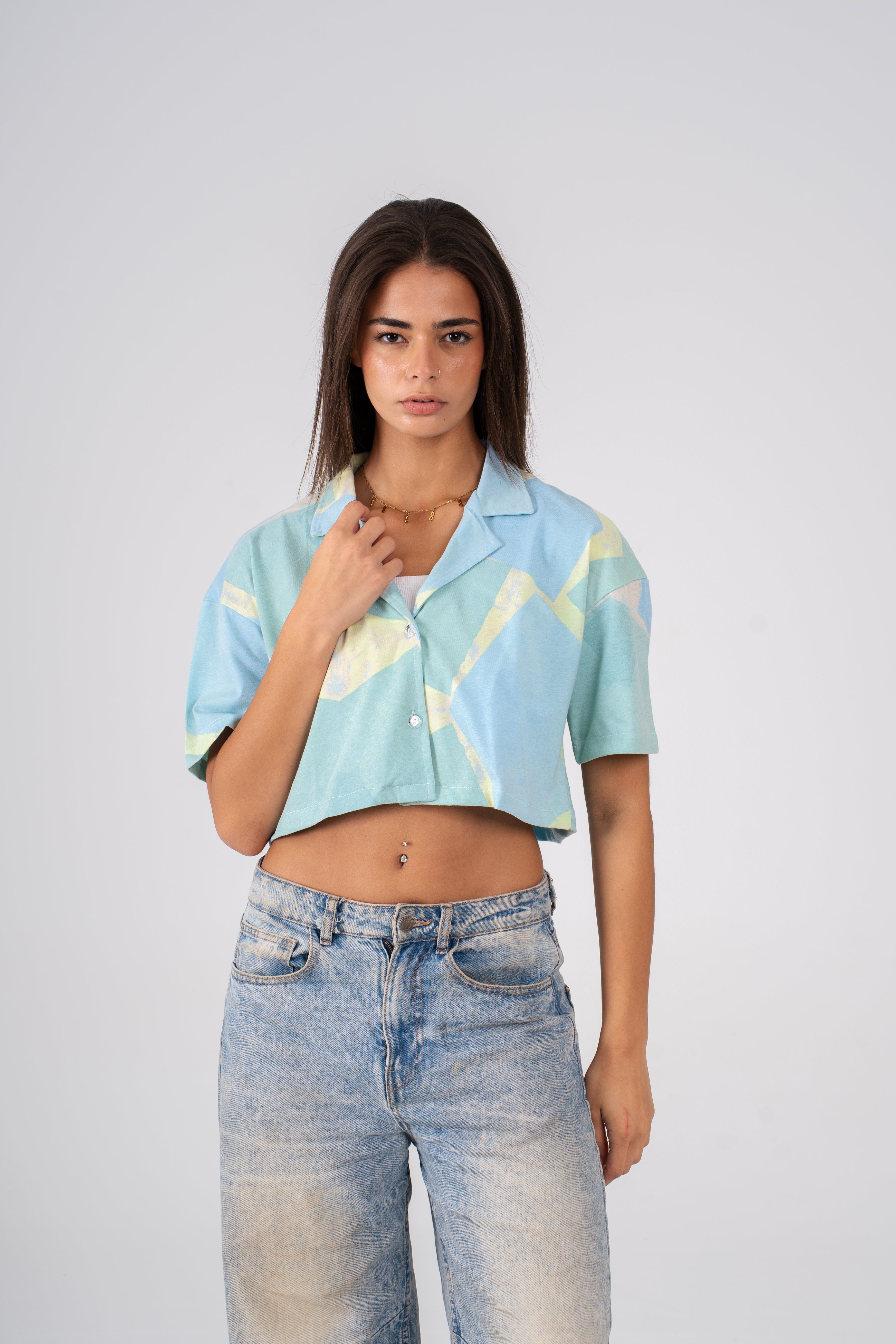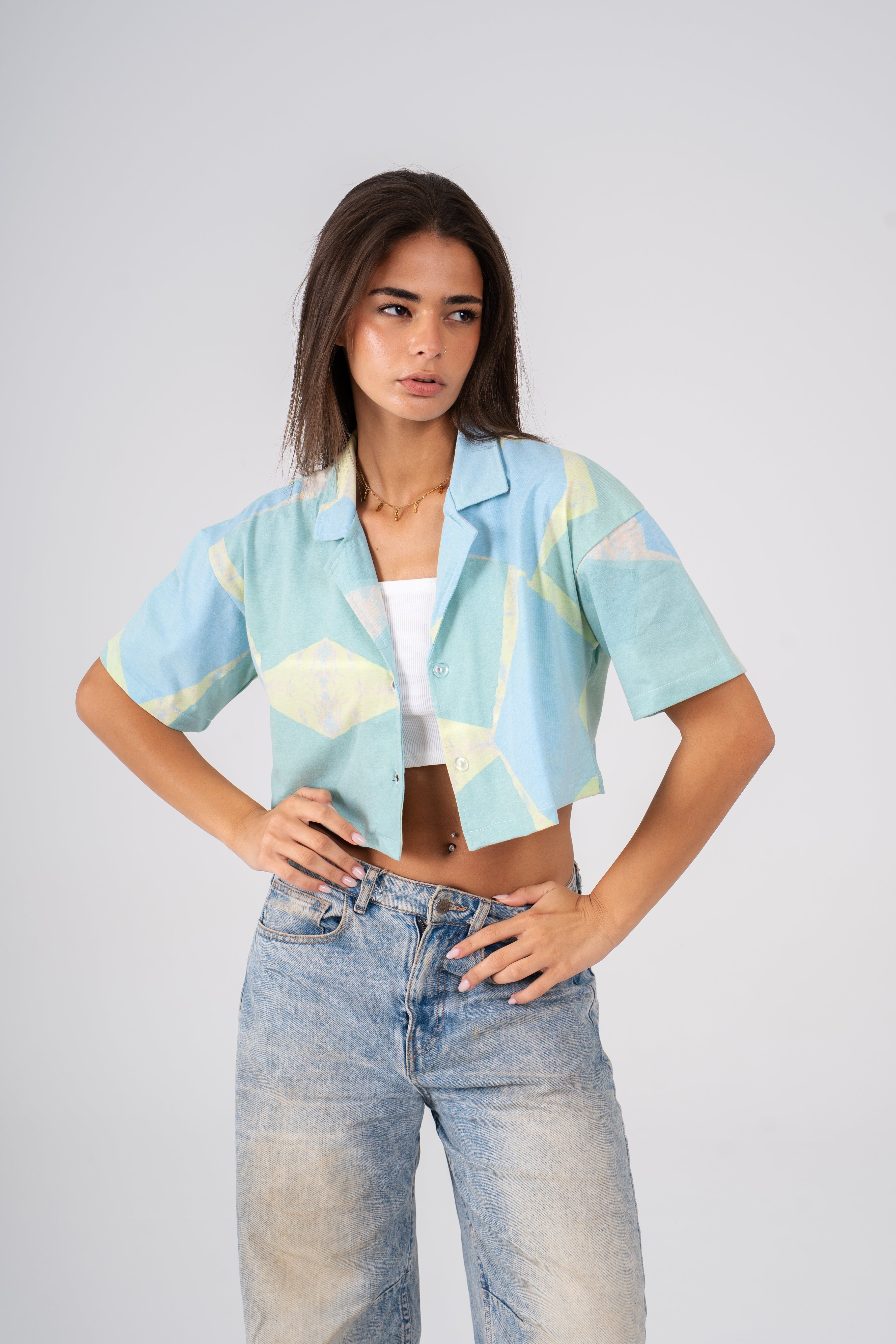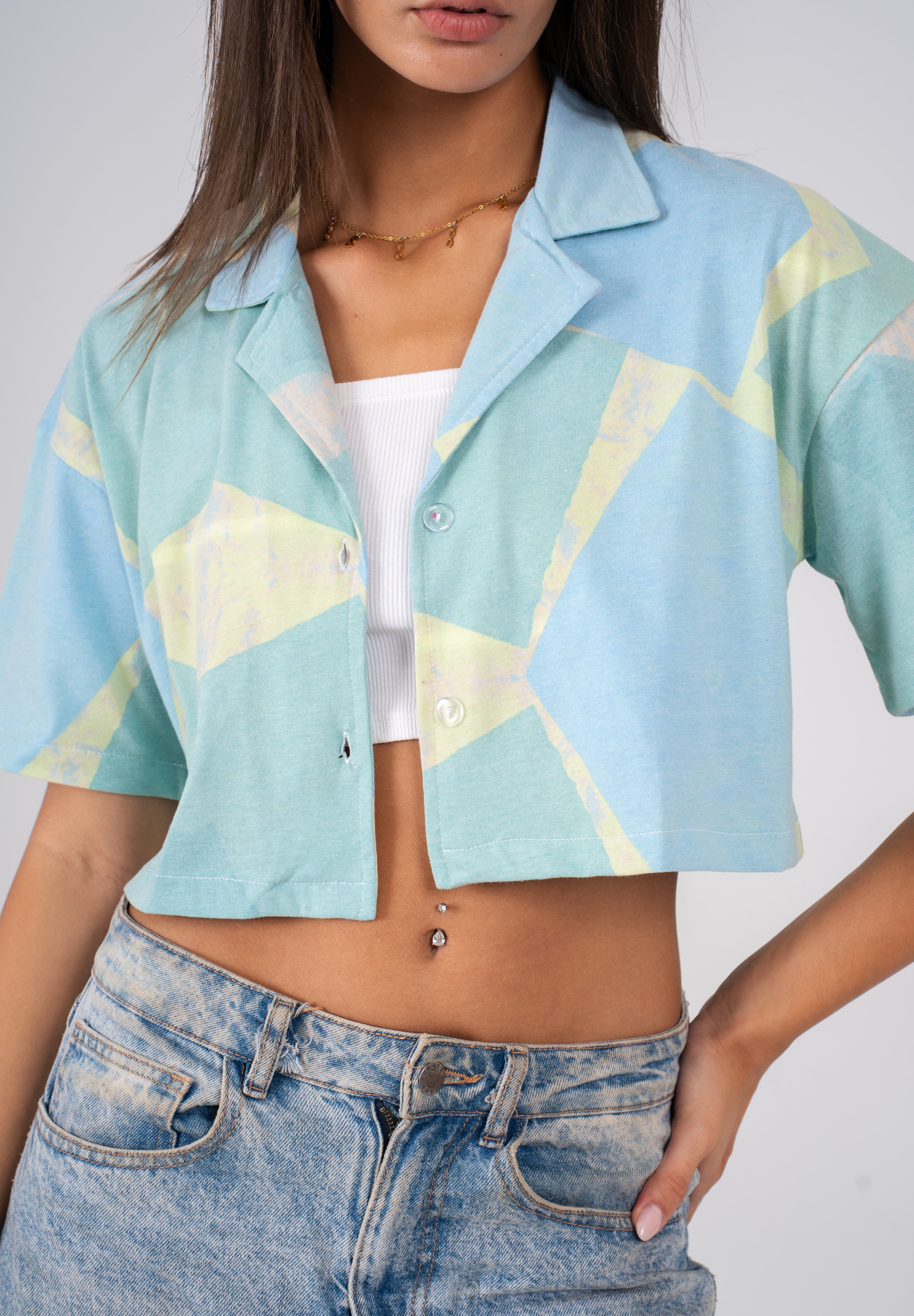 The Cropped shirt is designed for the hot summer season, its eye-catching design blends shades of green for a standout look that compliments any outfit. Its lightweight fabric is perfect for keeping you cool for hot beach days.