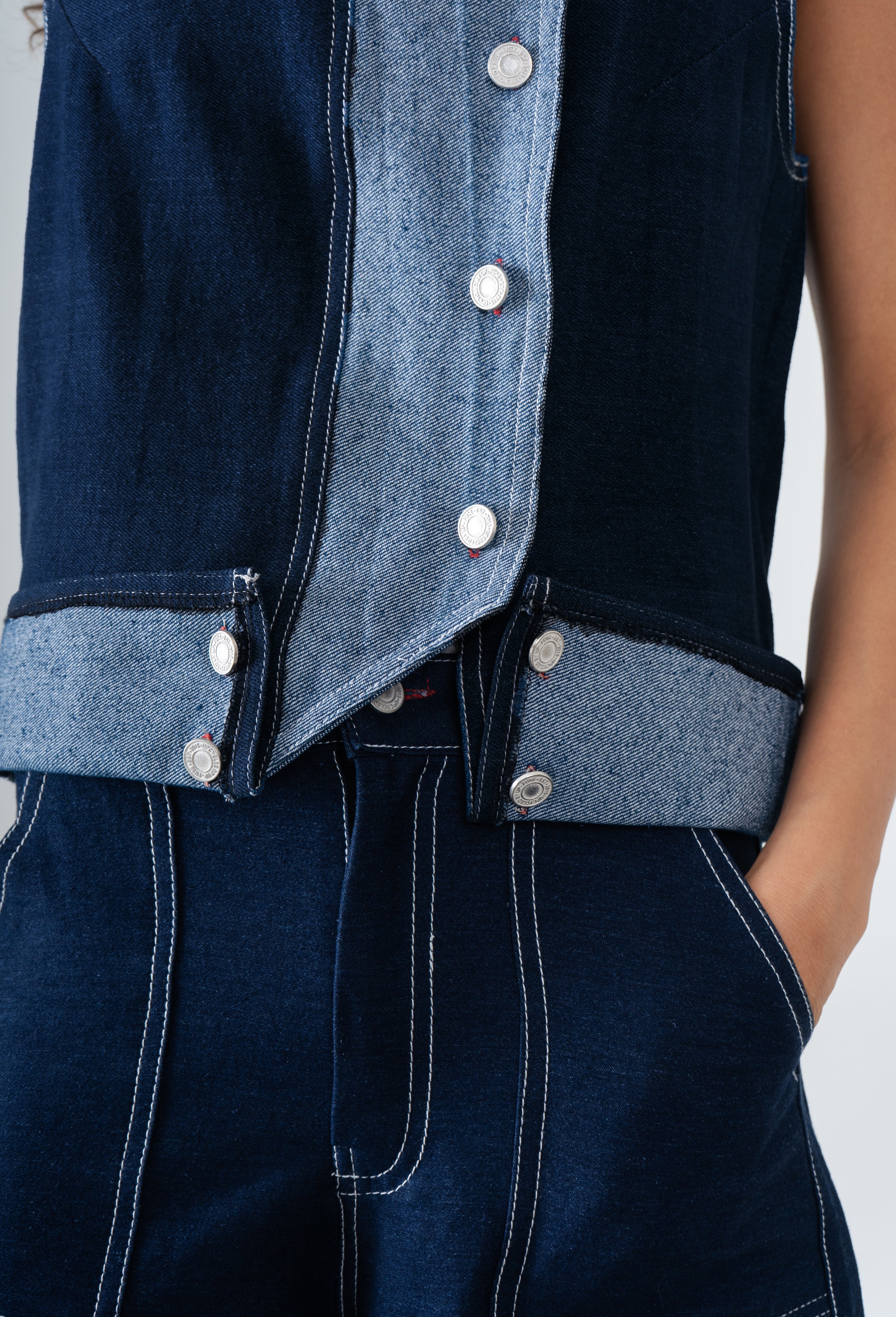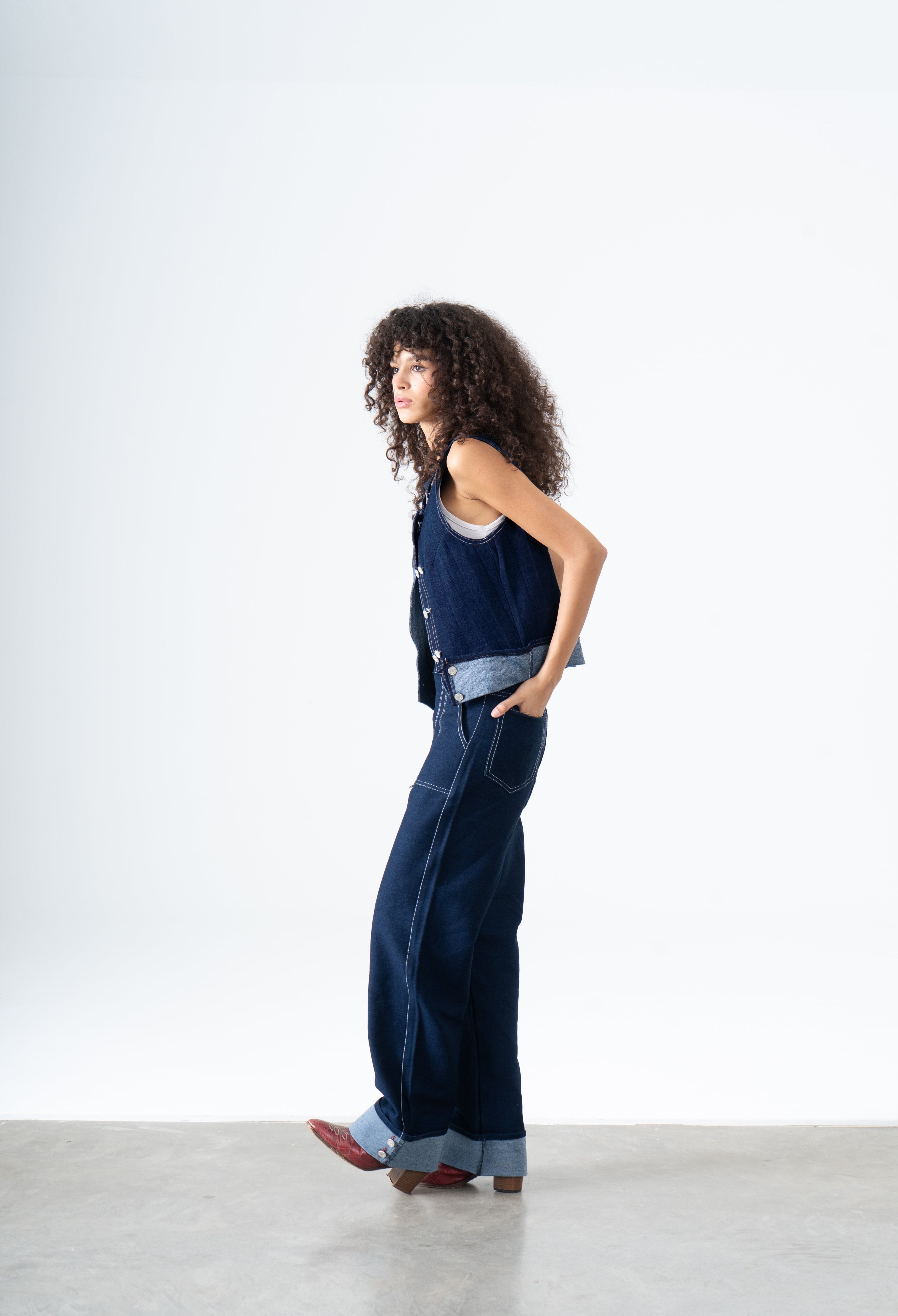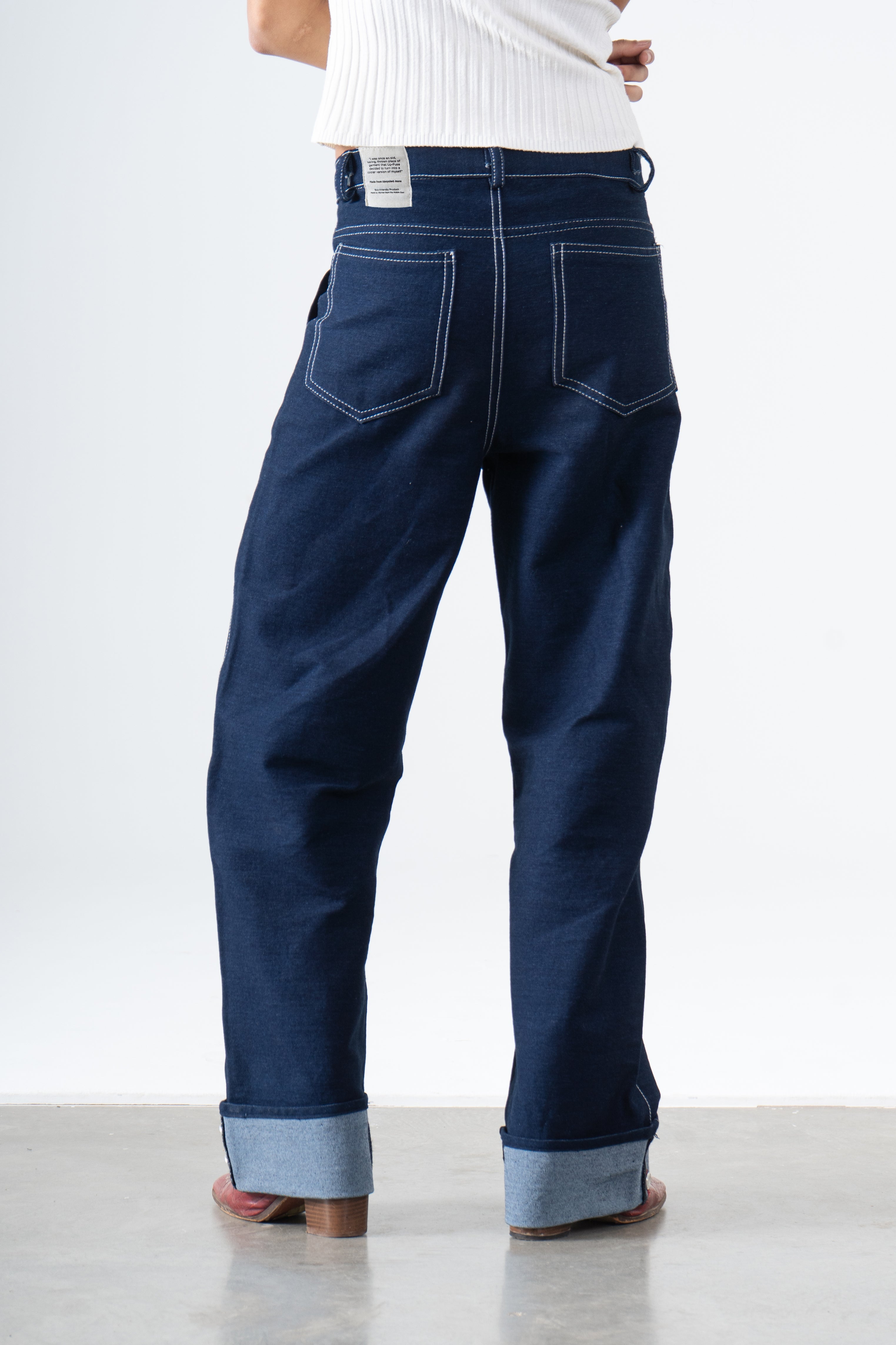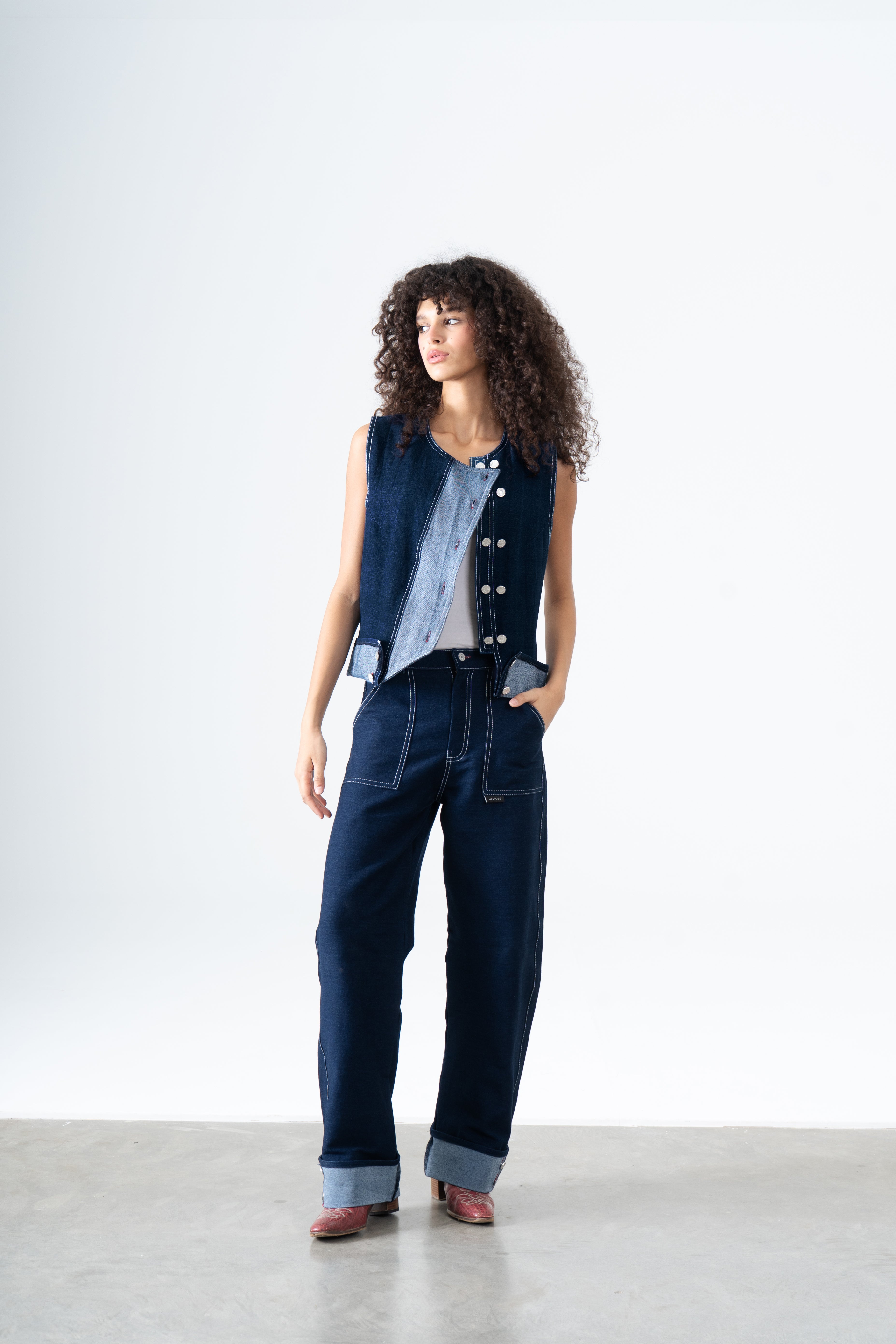 Crafted from upcycled denim, these pants feature a sleek, relaxed fit with a distinctive cuff detail. The contrasting denim cuff adds an unexpected edge, while the stylish button closures allow for versatile styling. Finished with clean, precise stitching, these pants effortlessly blend comfort with modern design. A wardrobe essential that elevates any look, day or night.