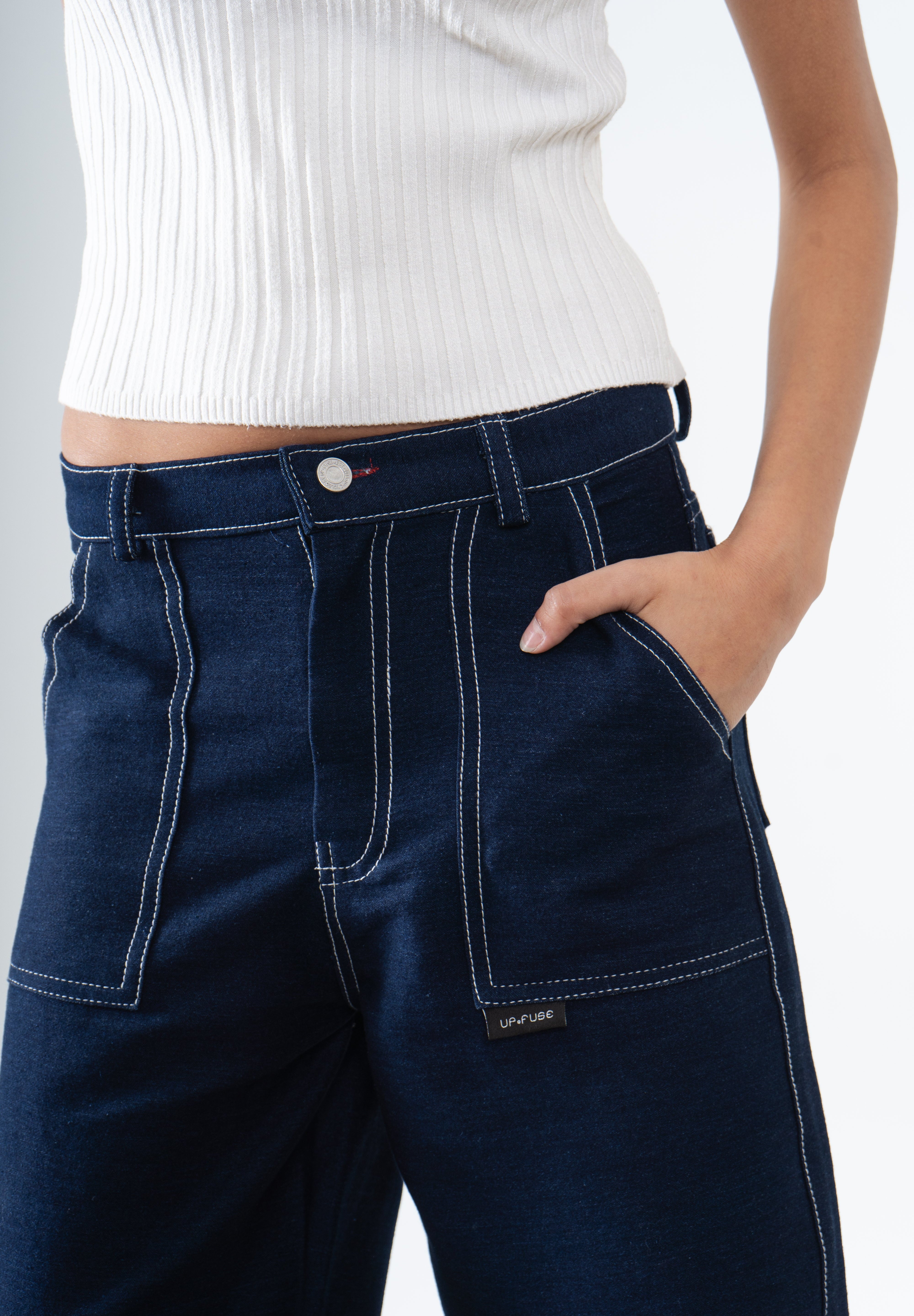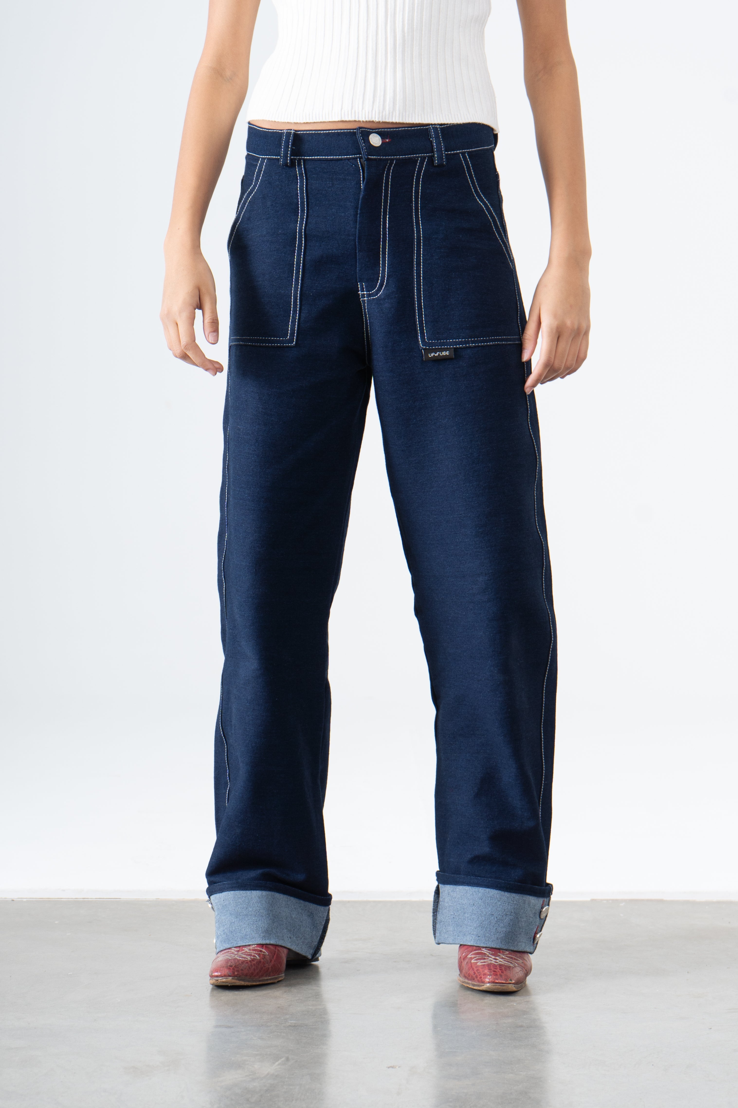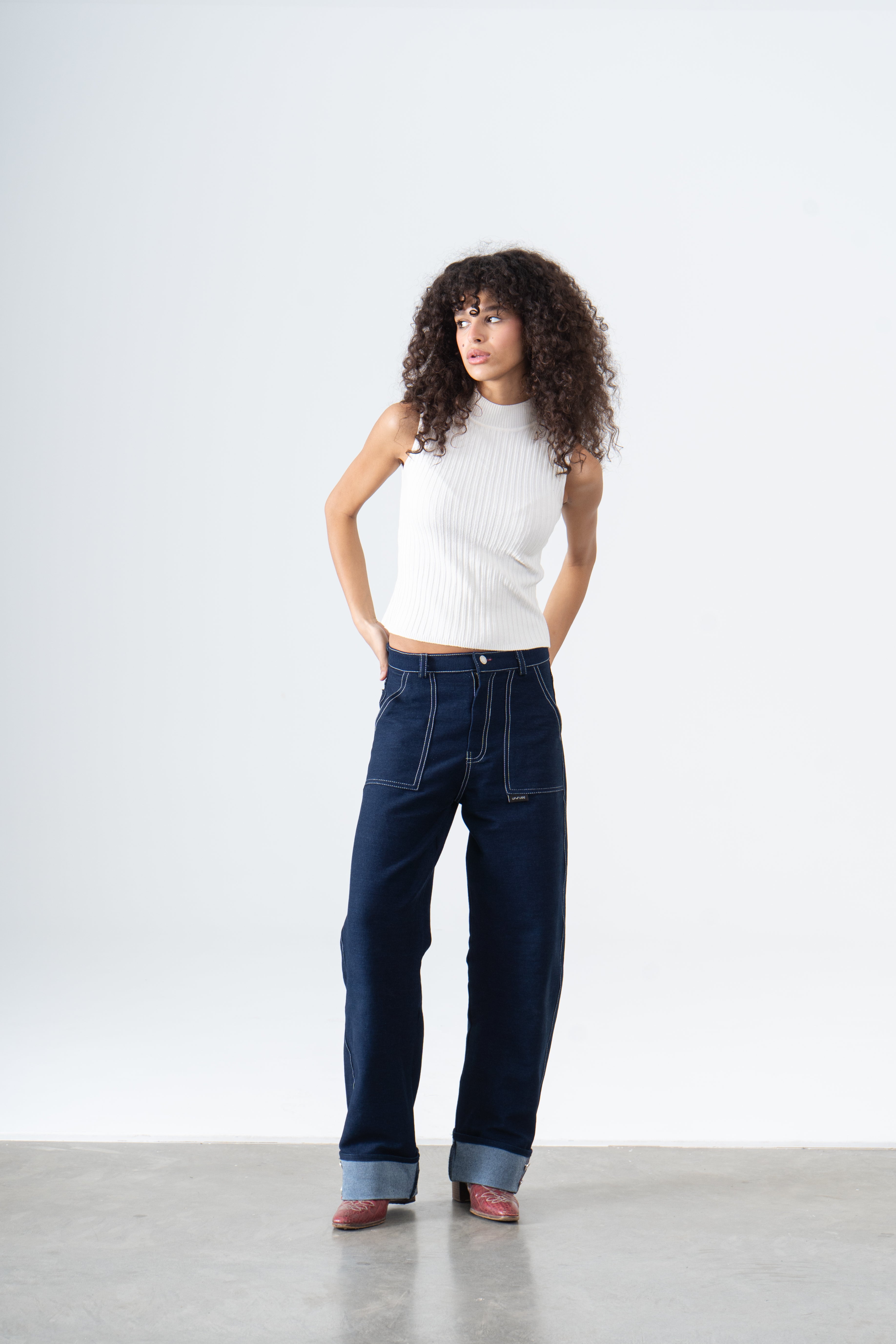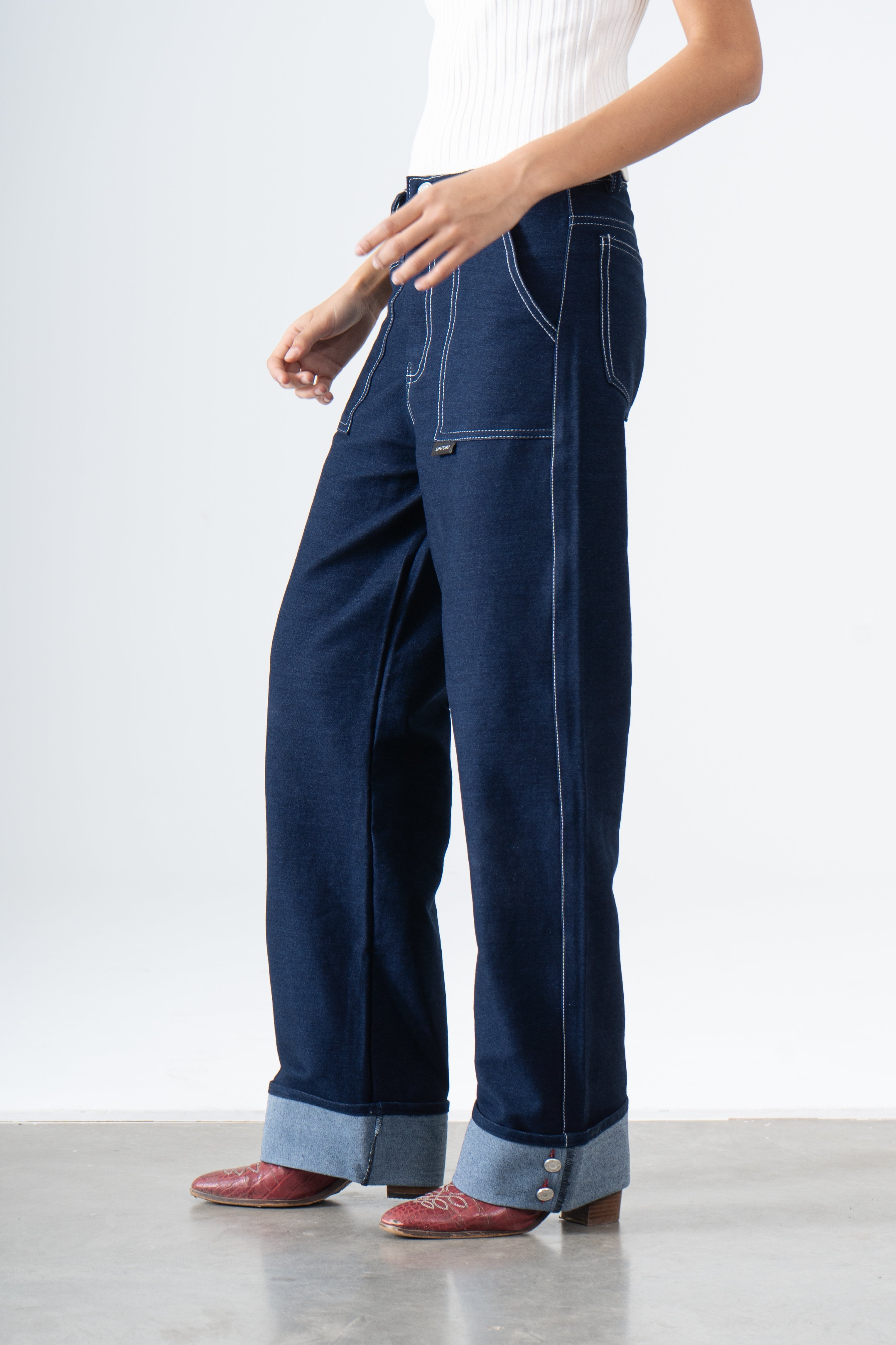 Crafted from upcycled denim, these pants feature a sleek, relaxed fit with a distinctive cuff detail. The contrasting denim cuff adds an unexpected edge, while the stylish button closures allow for versatile styling. Finished with clean, precise stitching, these pants effortlessly blend comfort with modern design. A wardrobe essential that elevates any look, day or night.