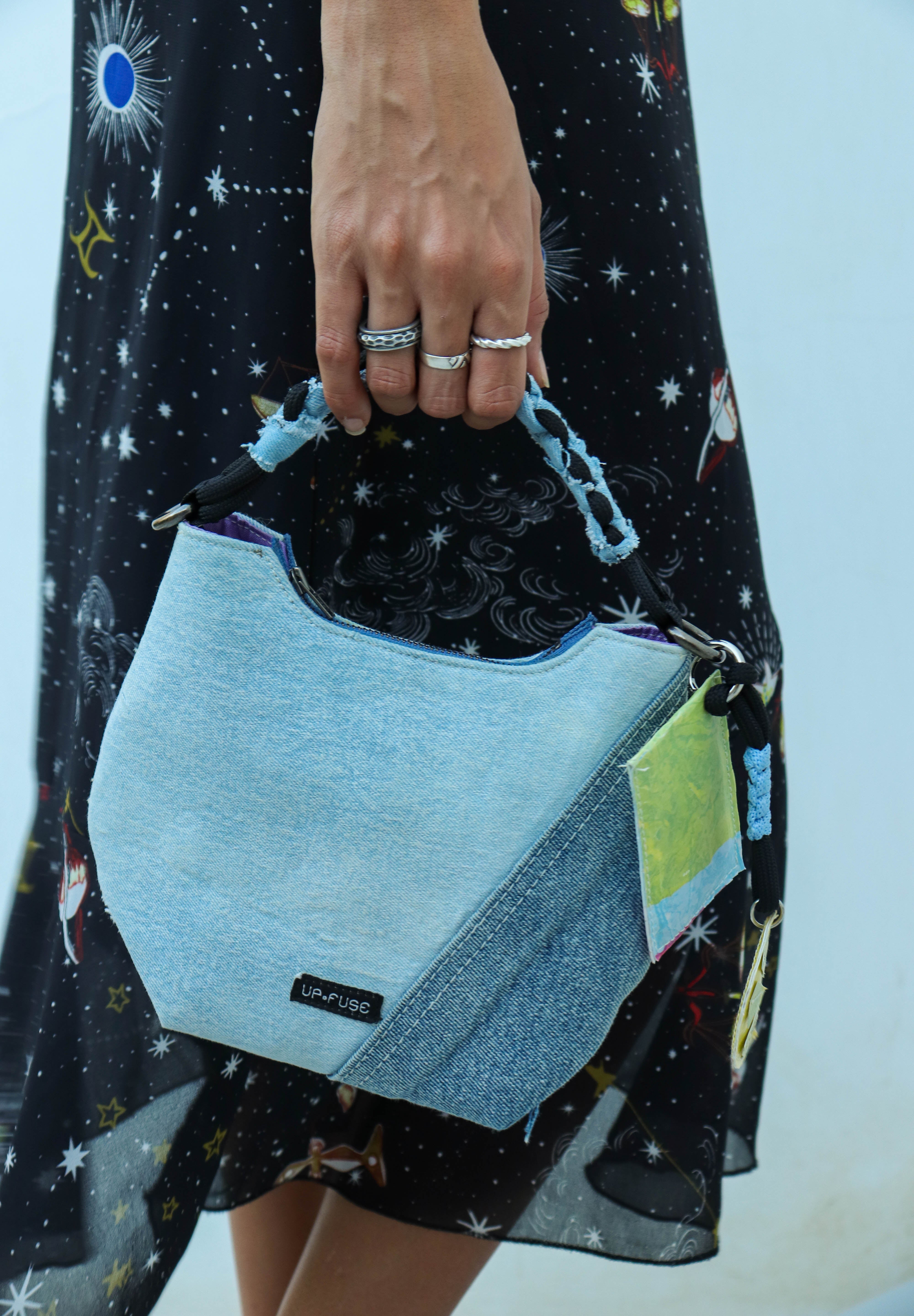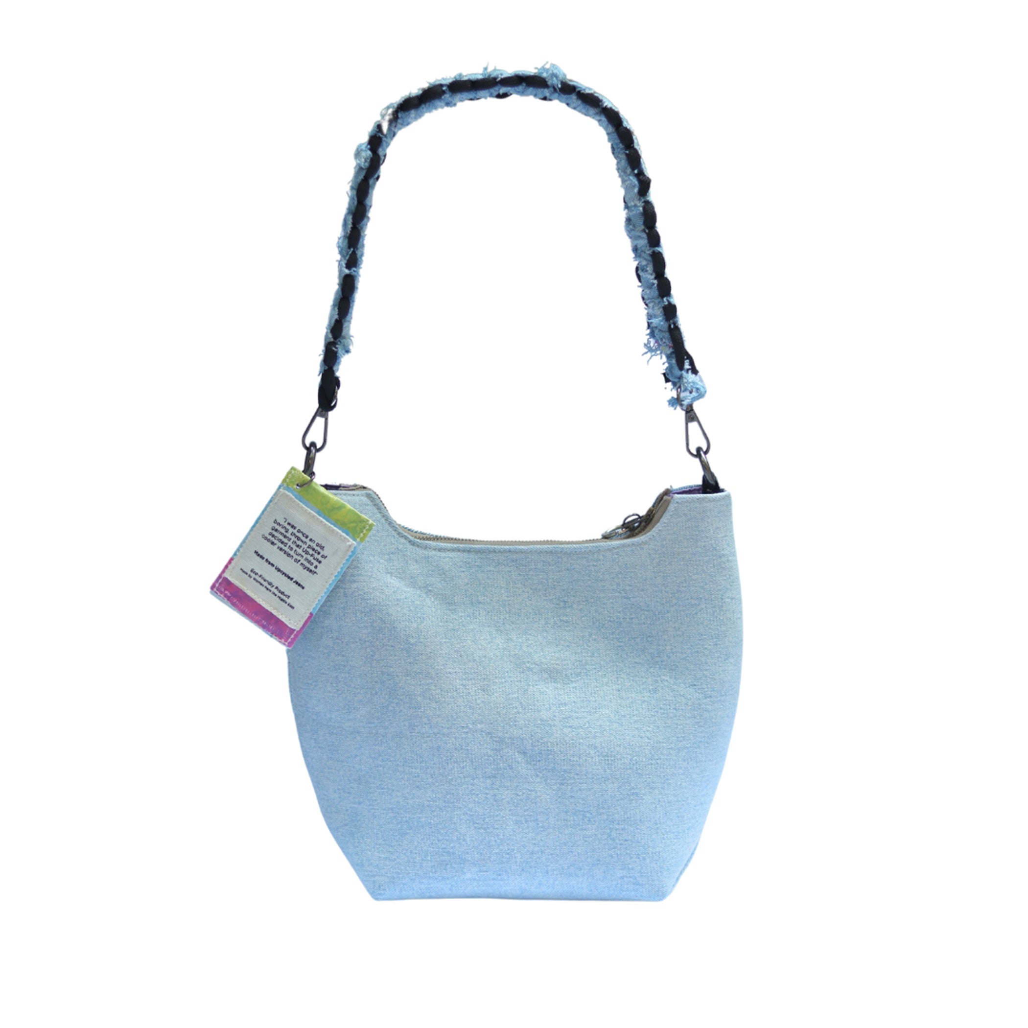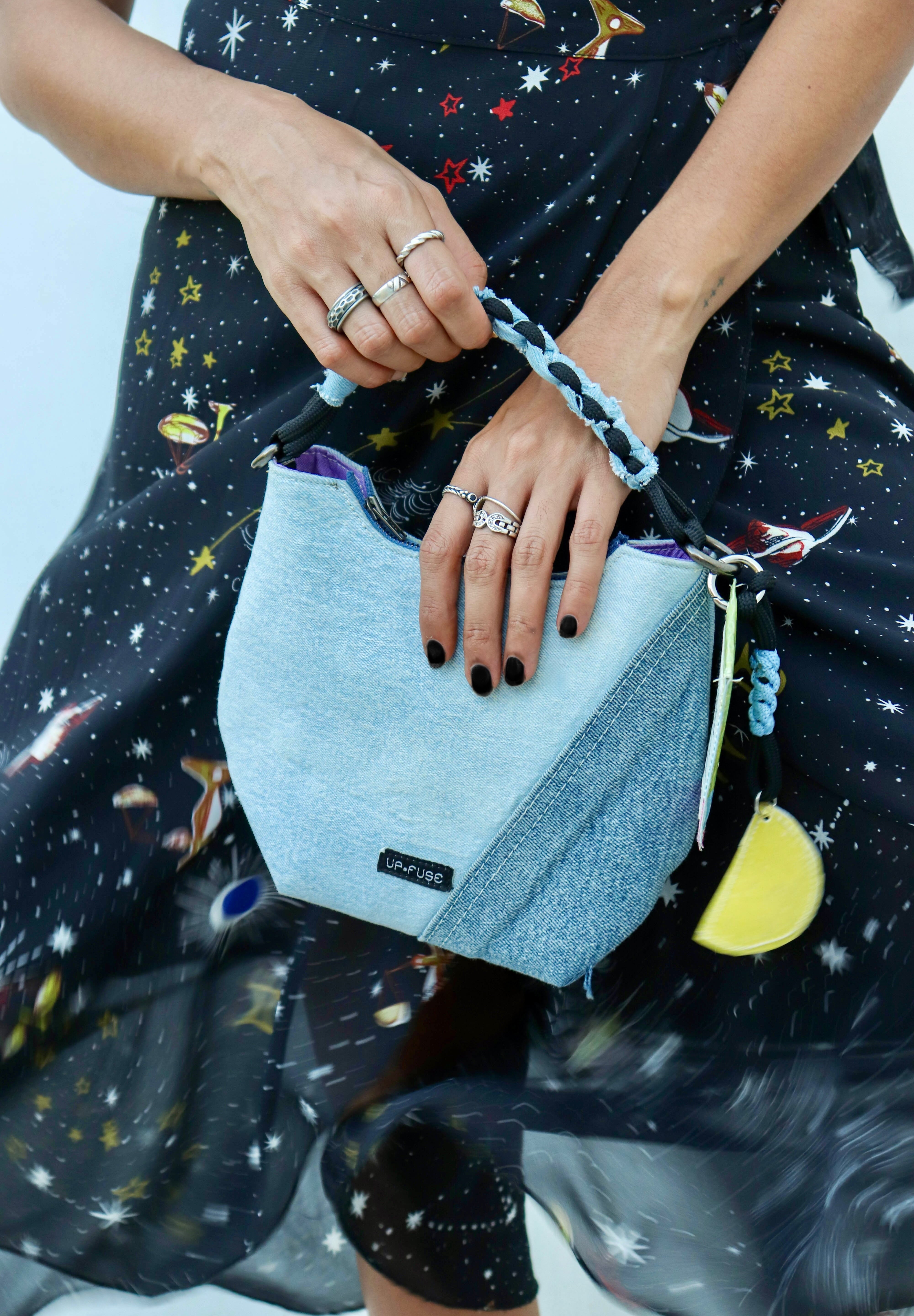 Introducing the Denim Affair Luna in Ice Blue, a stunning and eco-friendly accessory that brings a refreshing touch to your style. Expertly crafted from upcycled denim, this bag features a beautiful ice blue color that adds a cool, calming aesthetic to any outfit. Combining sustainability with functionality, it is equipped with a sturdy metal zipper, a macrame cord handle, and an extra adjustable crossbody strap for versatile carrying options. Inside, you’ll find two practical pockets to keep your essentials organized and easily accessible. Available in two sizes, the Denim Affair Luna in Ice Blue is the perfect companion for both casual outings and polished events, elevating your wardrobe while promoting environmental consciousness.