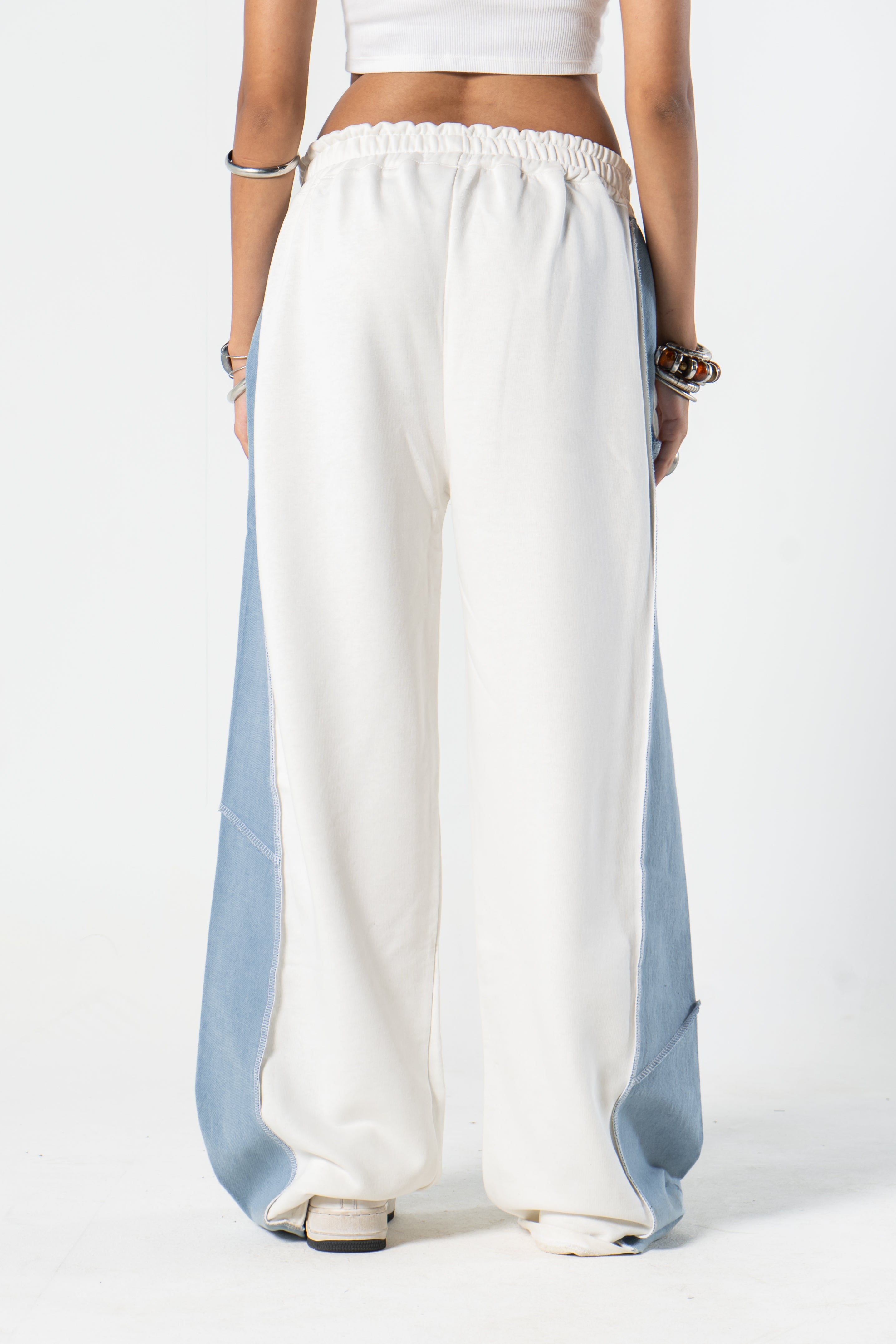 Each pair of pants is one-of-a-kind due to the upcycled denim used in their construction. The denim patches and accents create a distinctive and visually appealing look, showcasing the beauty of repurposed materials.