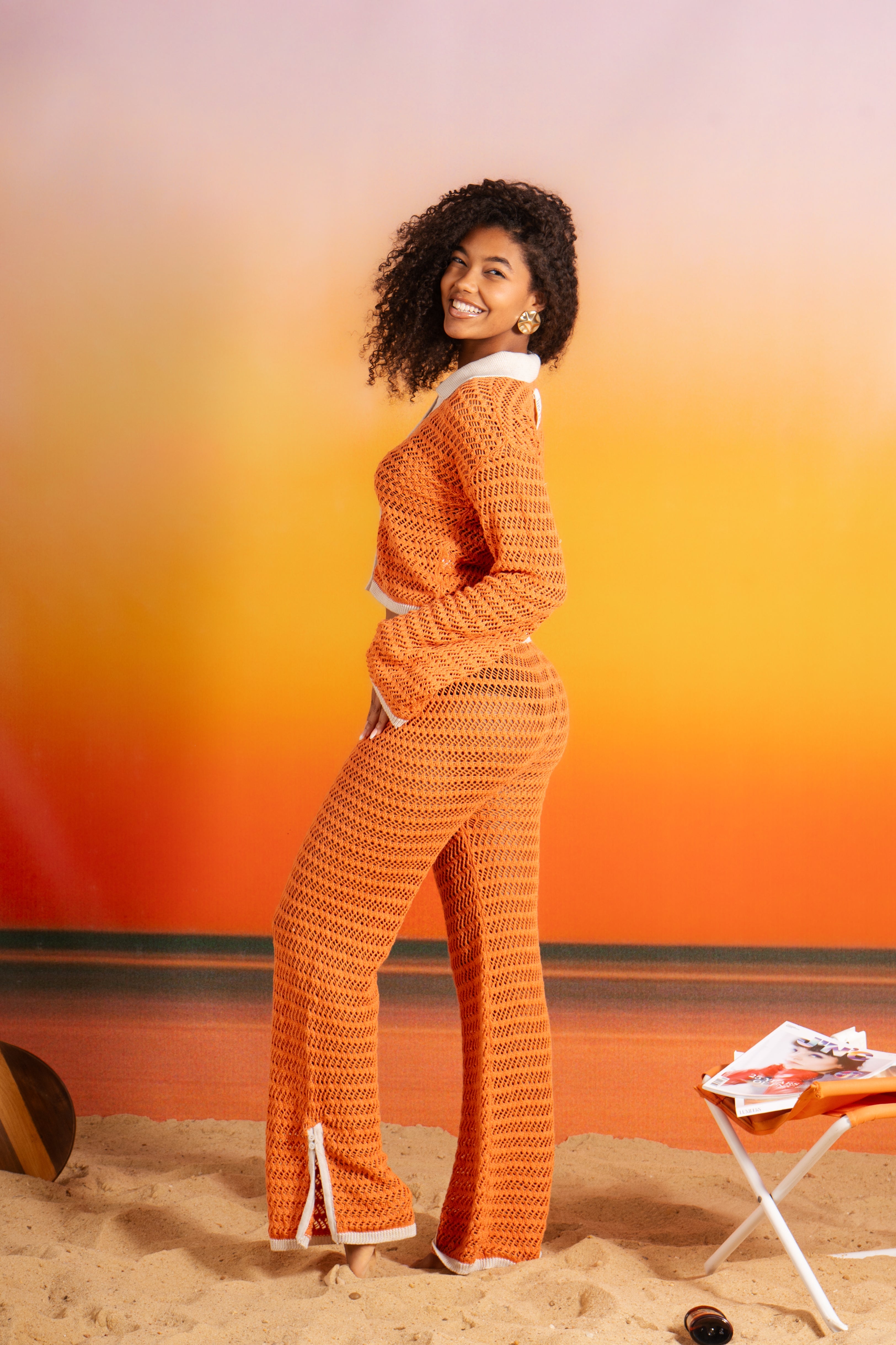 This open-knit two-piece set features a relaxed button-up with flared sleeves and matching drawstring pants. Breathable enough for beach strolls, polished enough for golden hour plans.