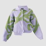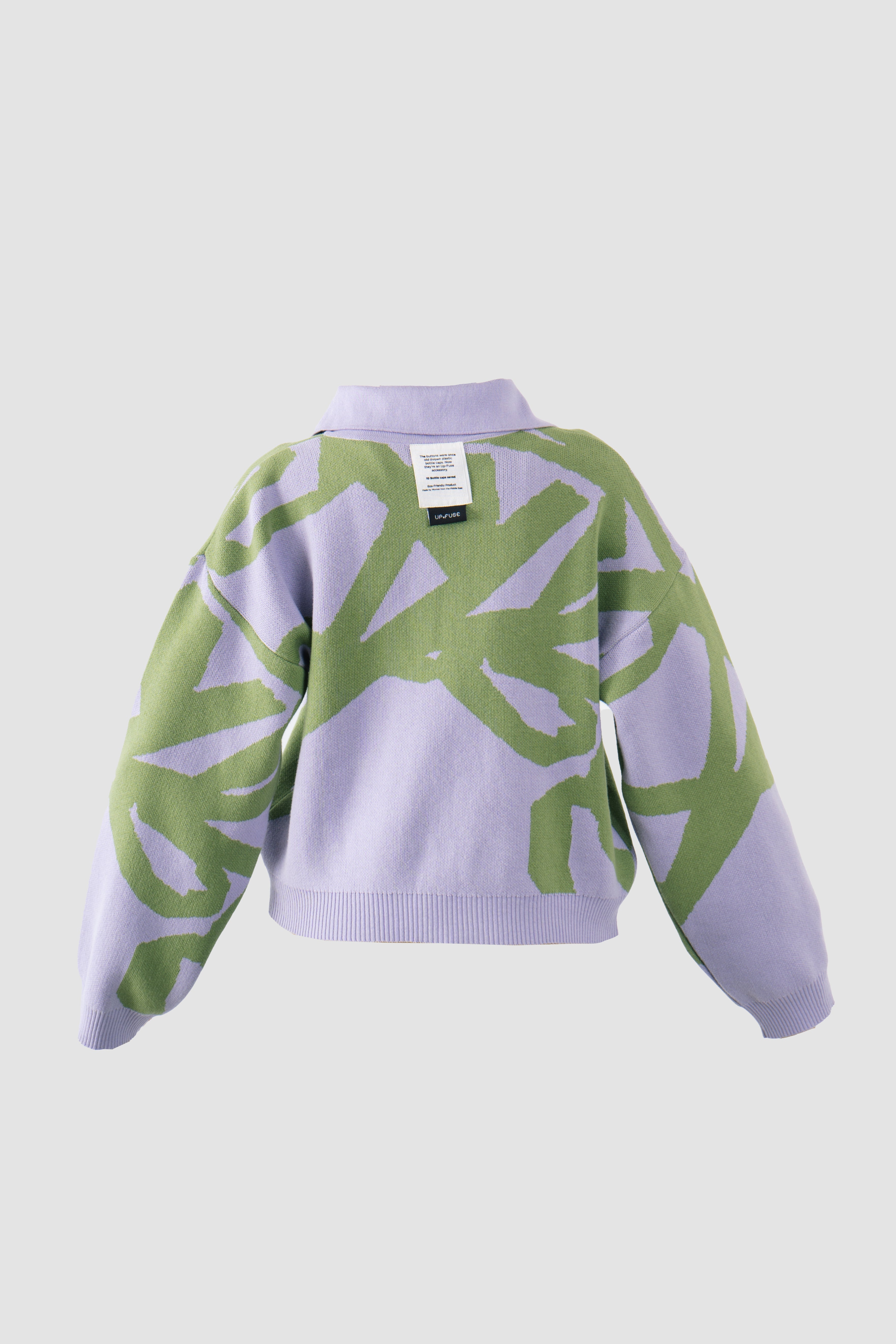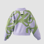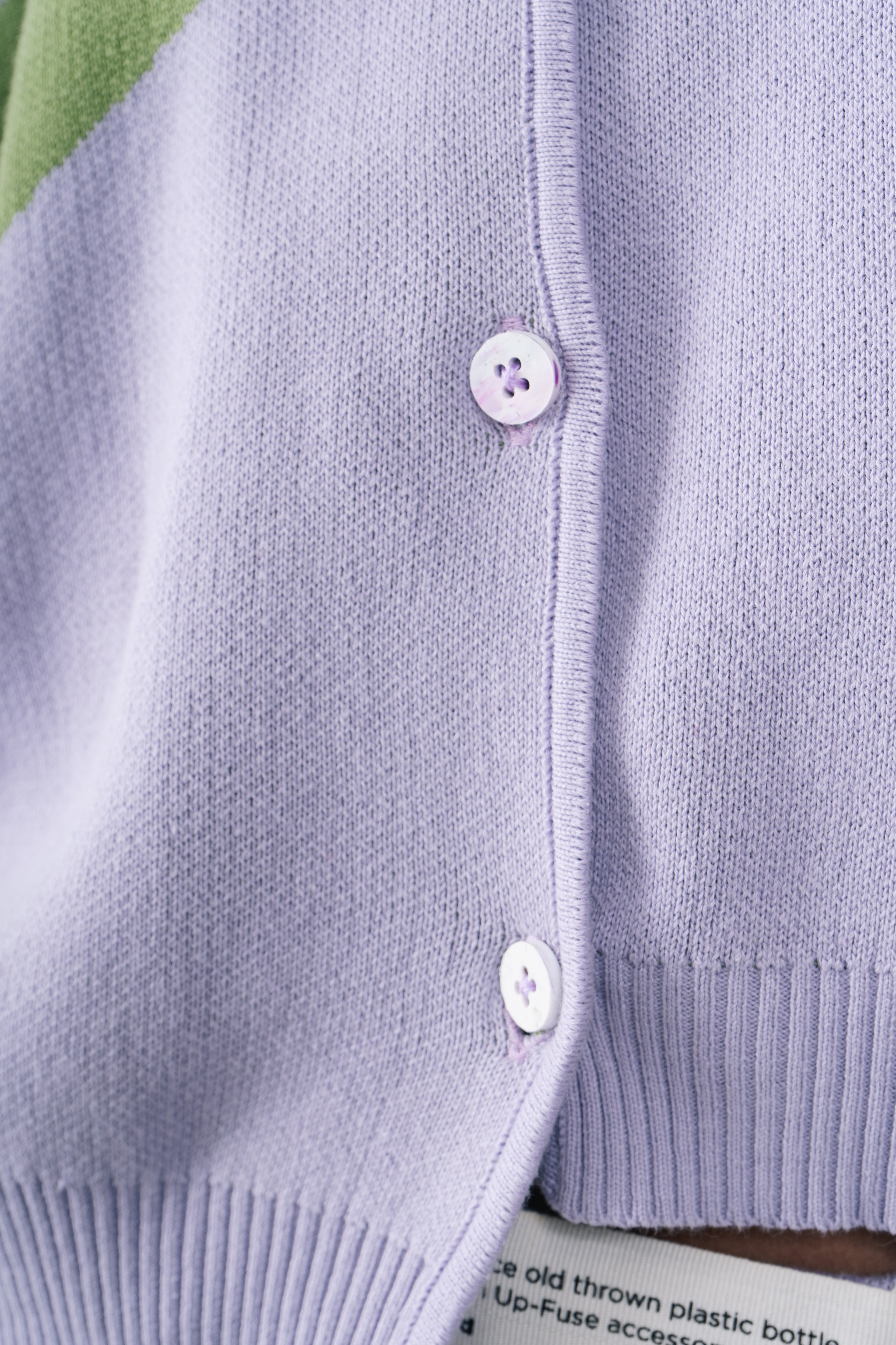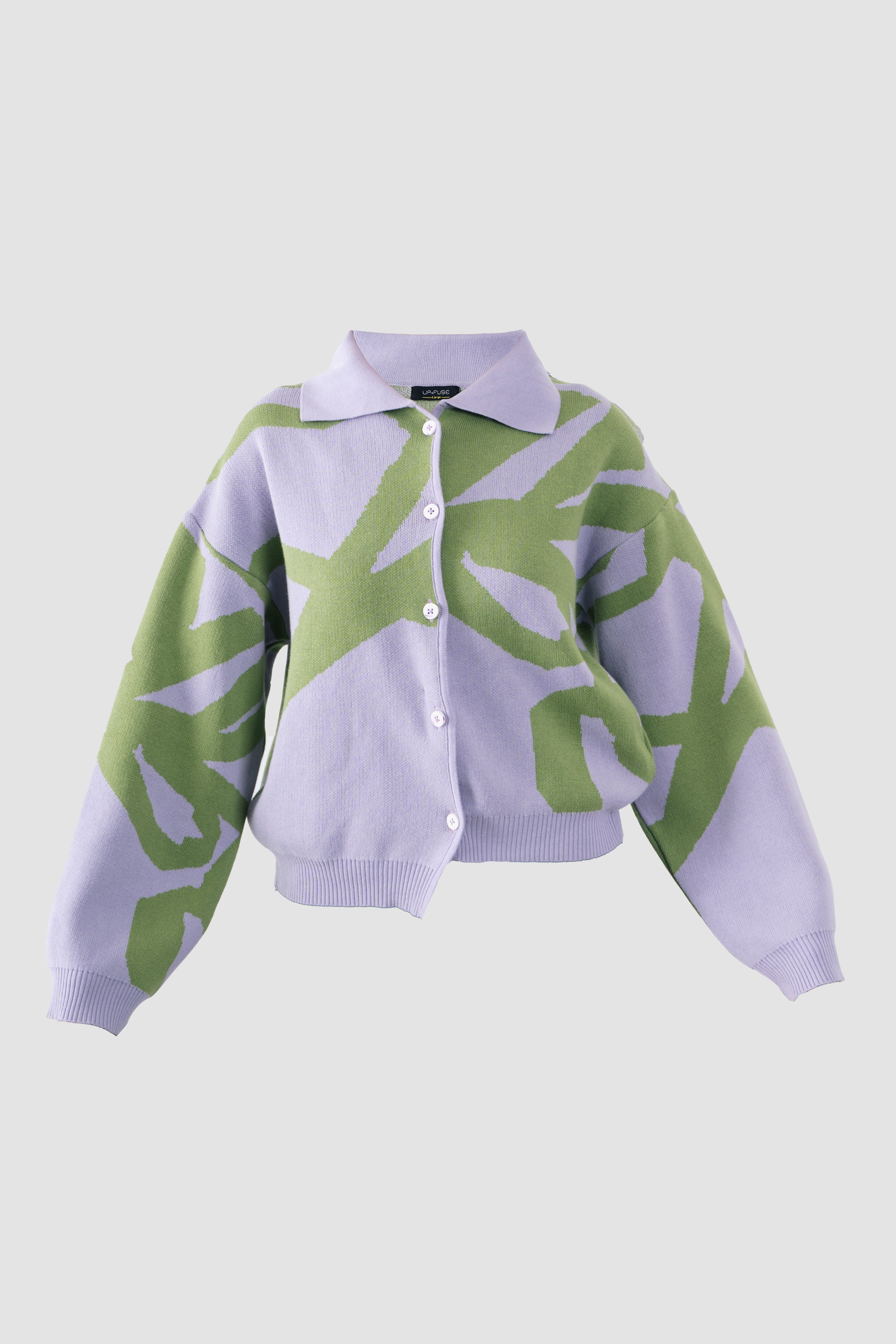 An Asymmetrical Relaxed Fit Cardigan: Crafted with our bold black-and-white signature pattern, this button-up cardigan brings a contemporary edge to a classic silhouette. The asymmetrical hemline adds a unique twist, while the buttons—sustainably made from recycled bottle caps—combine eco-consciousness with chic design. The slightly cropped length enhances its playful and modern appeal, making it perfect for layering or wearing as a statement piece.