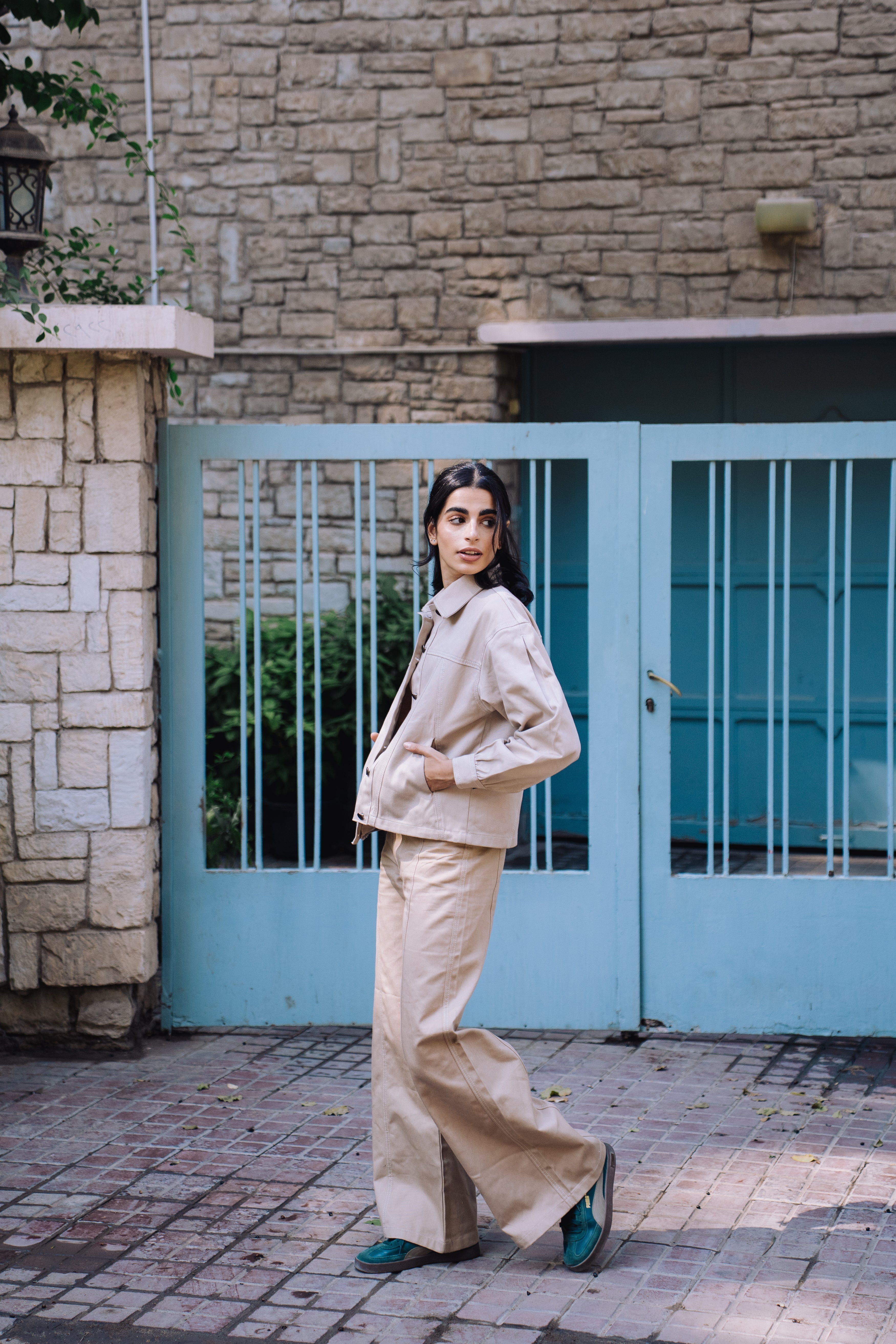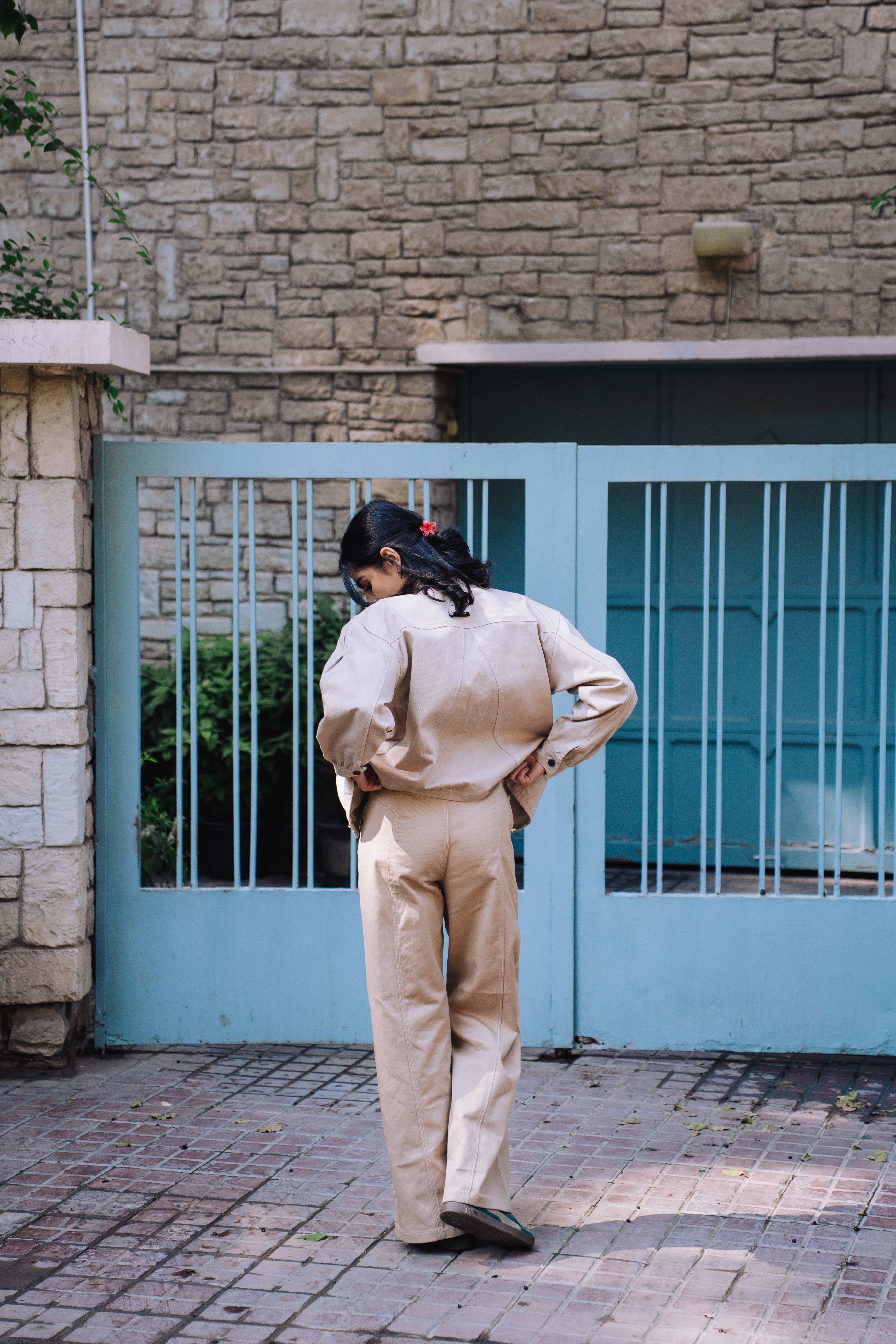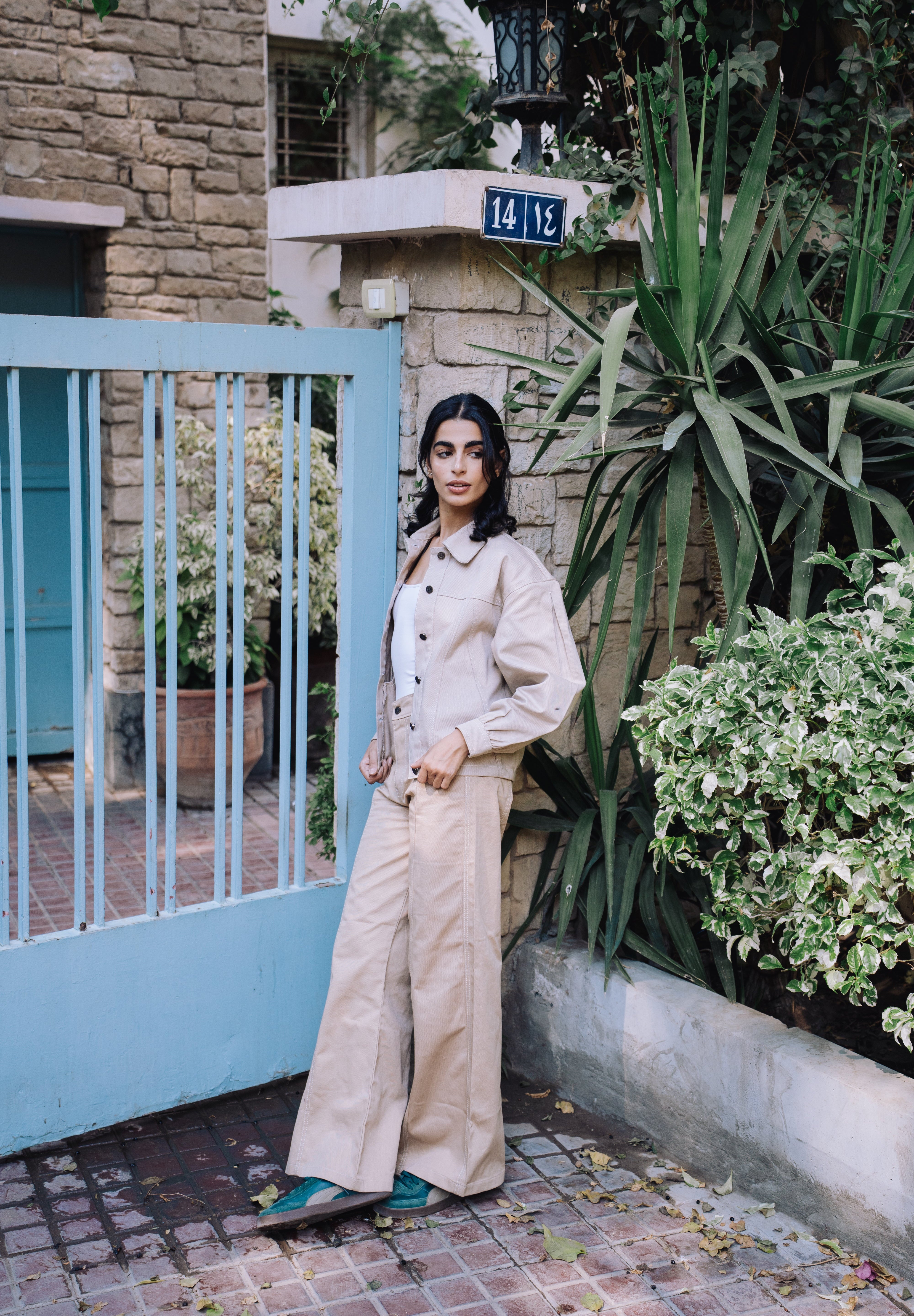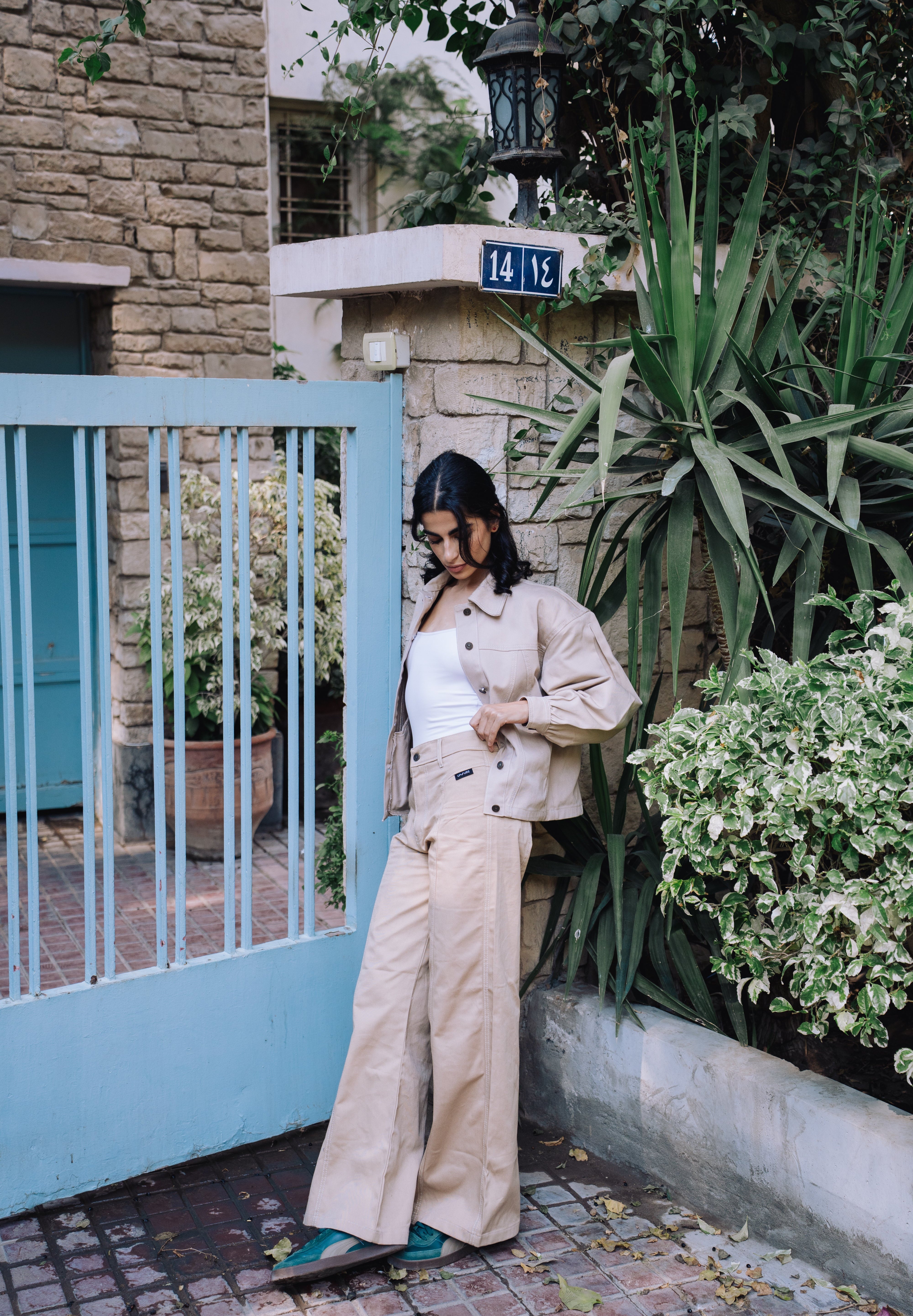 Cut from upcycled gabardine and ethically crafted in Egypt, these trousers reimagine classic tailoring through a sustainable lens. The fabric’s smooth yet resilient texture gives a structured silhouette that moves with ease, grounding any outfit with understated sophistication.