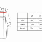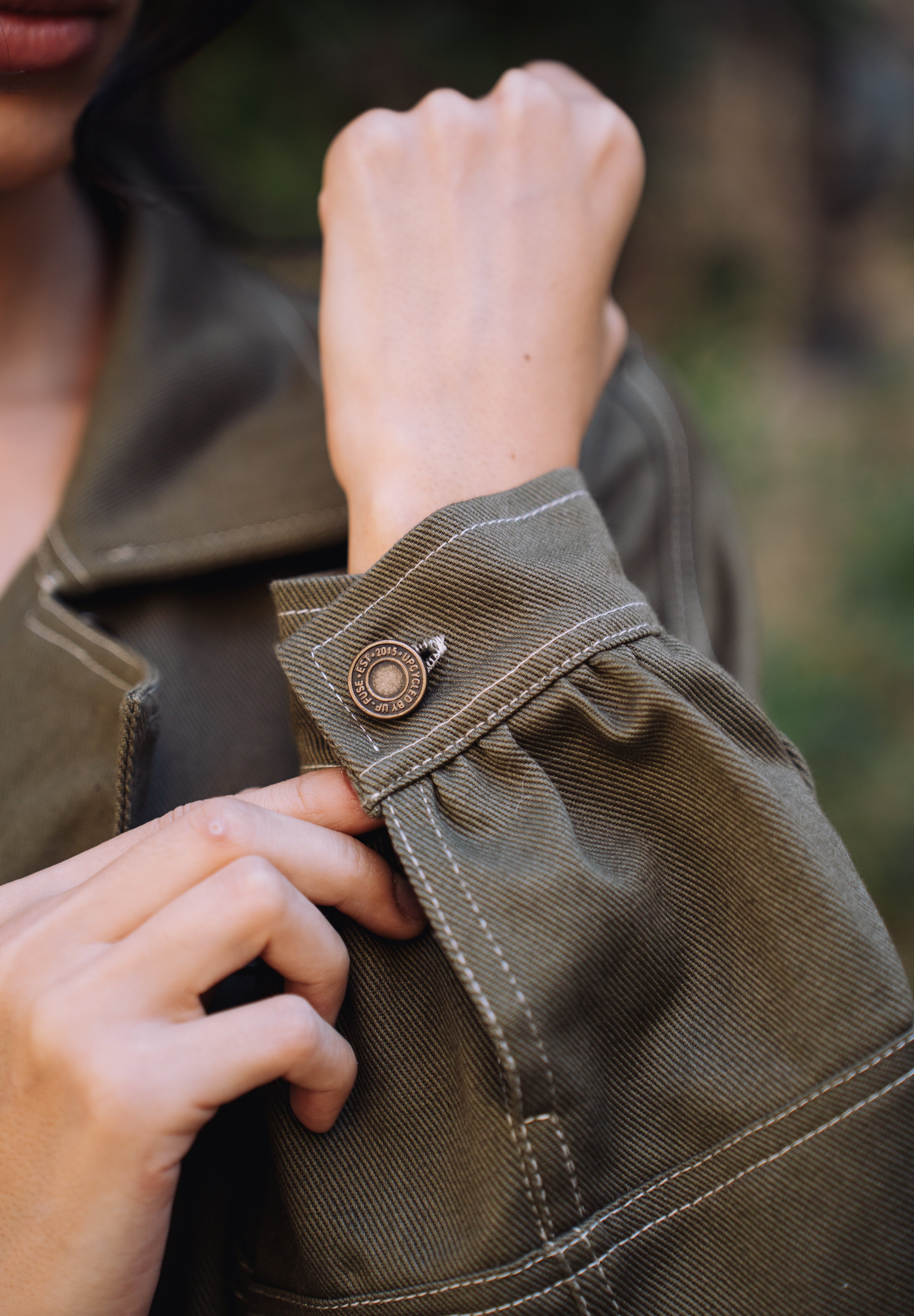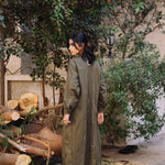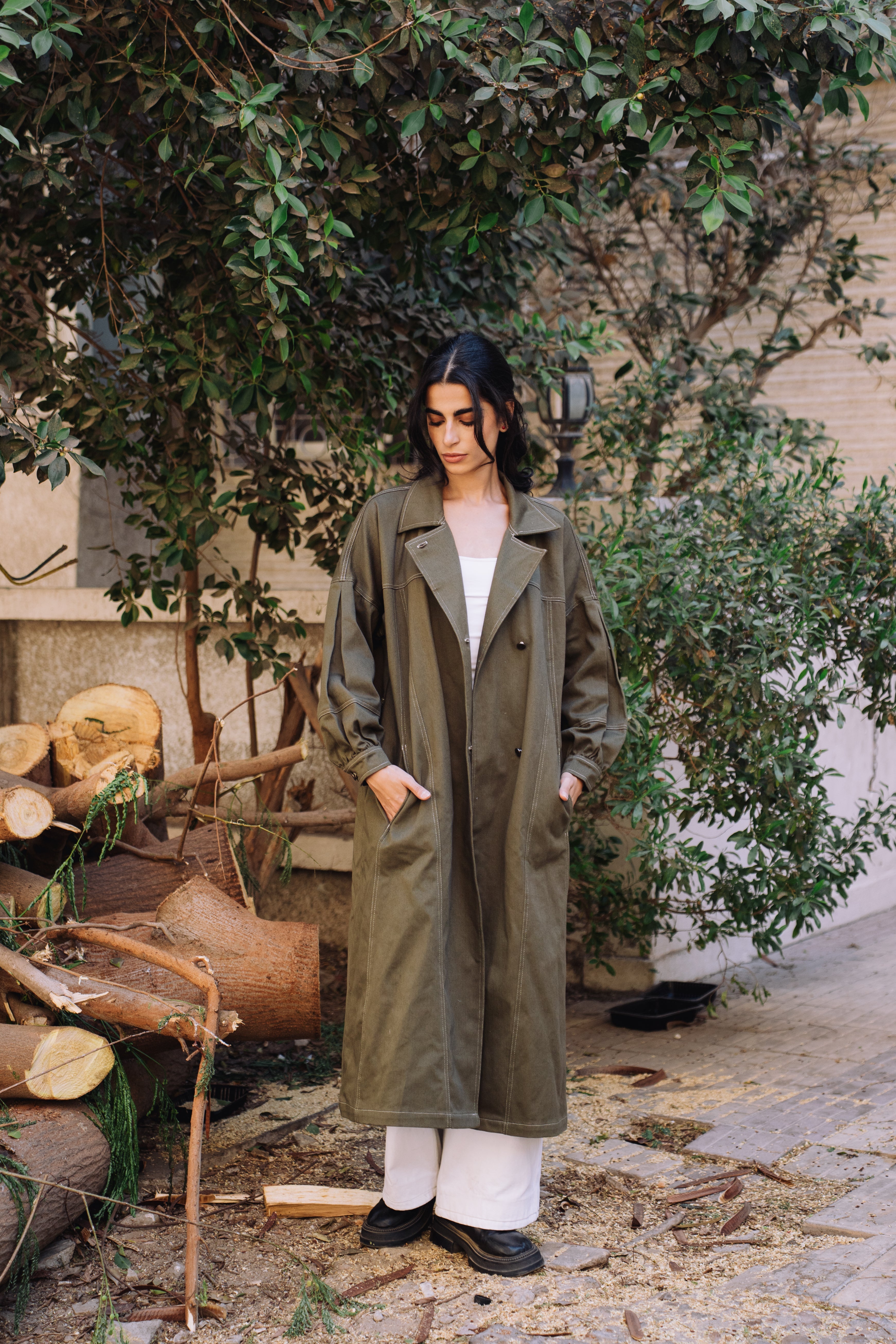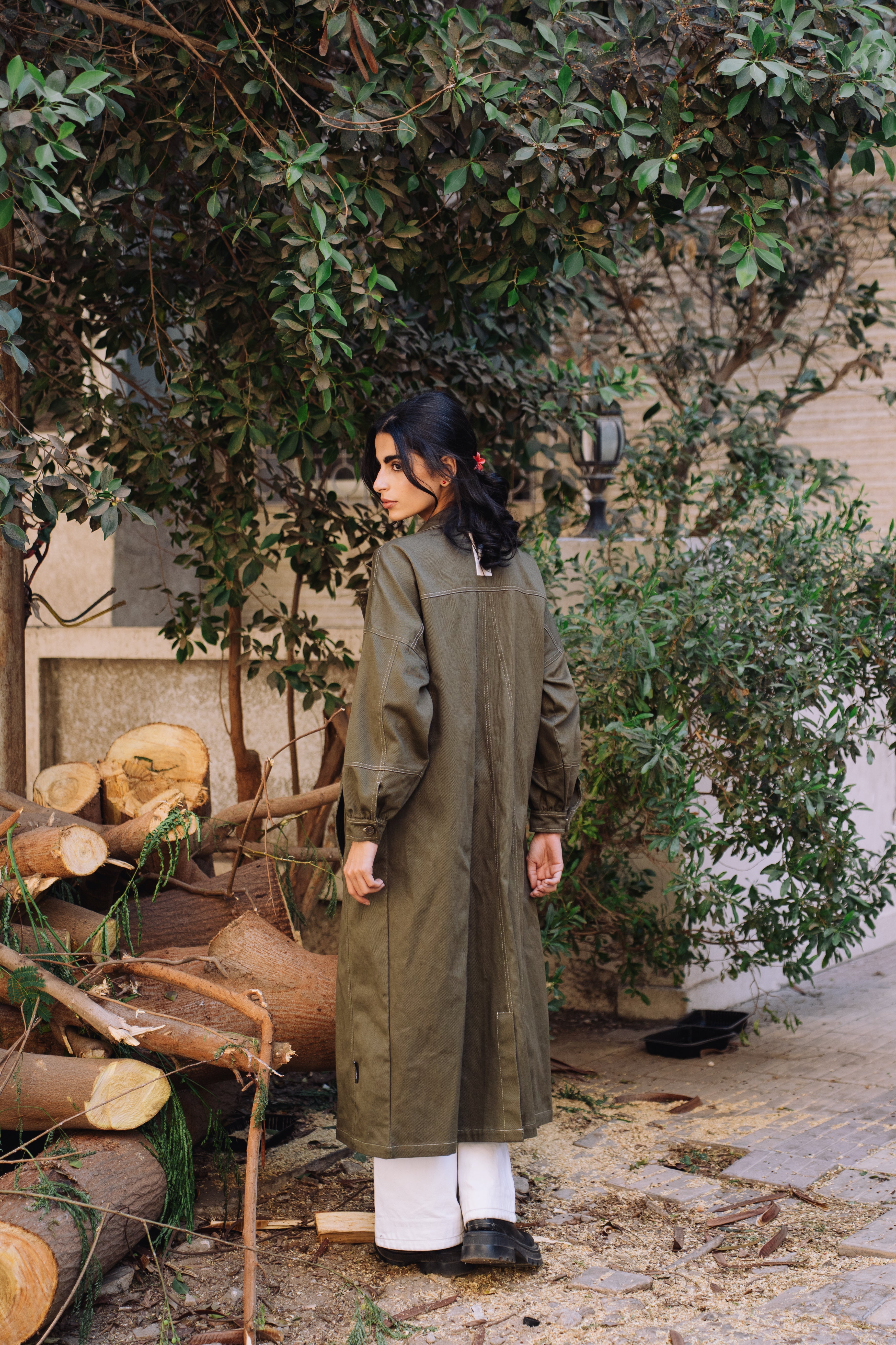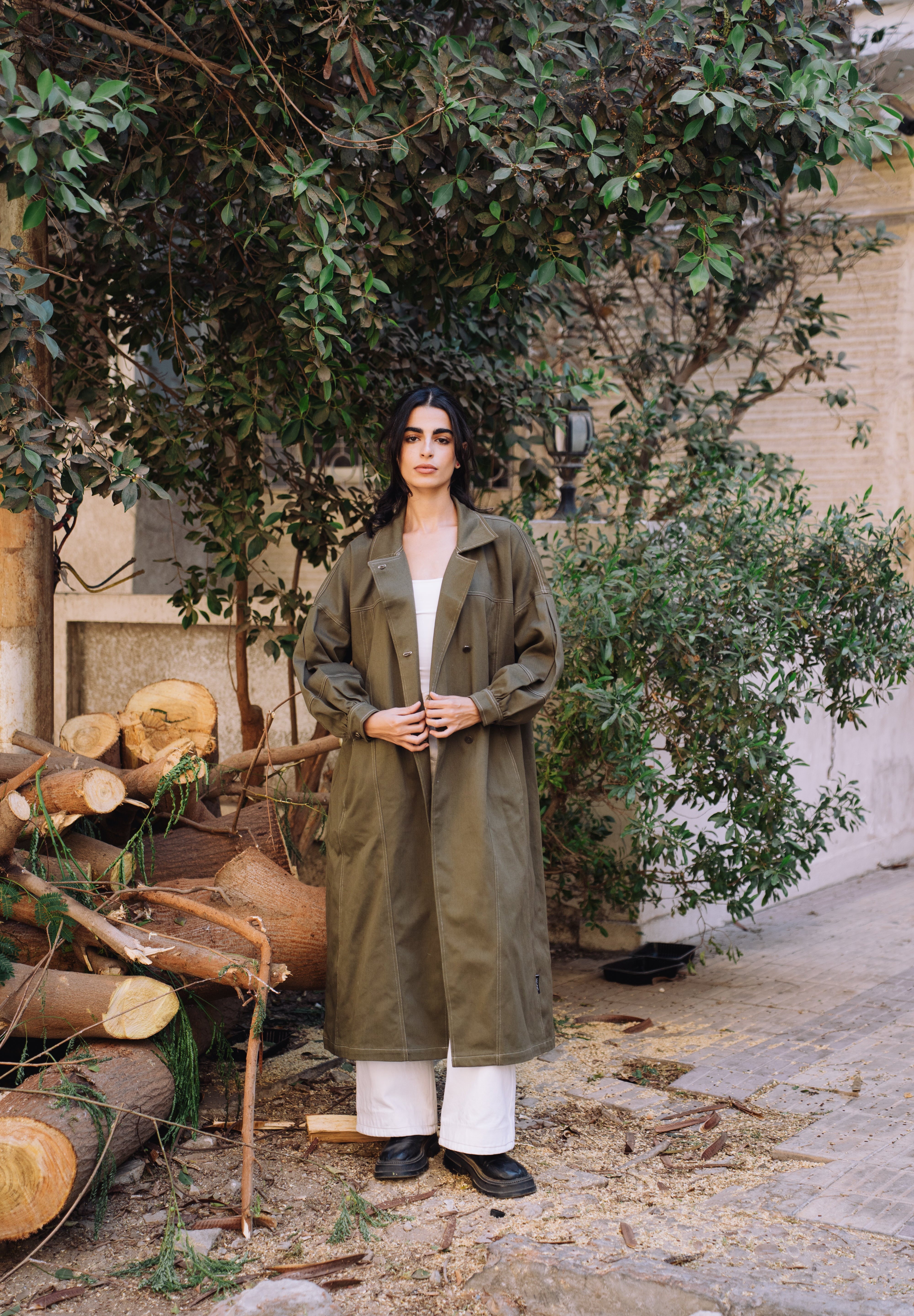 Made from upcycled gabardine, each piece is ethically crafted in Egypt by local artisans who transform surplus fabric into wearable art. The coat’s crisp texture and natural drape reflect the balance between structure and ease, ideal for layering as temperatures fall.
