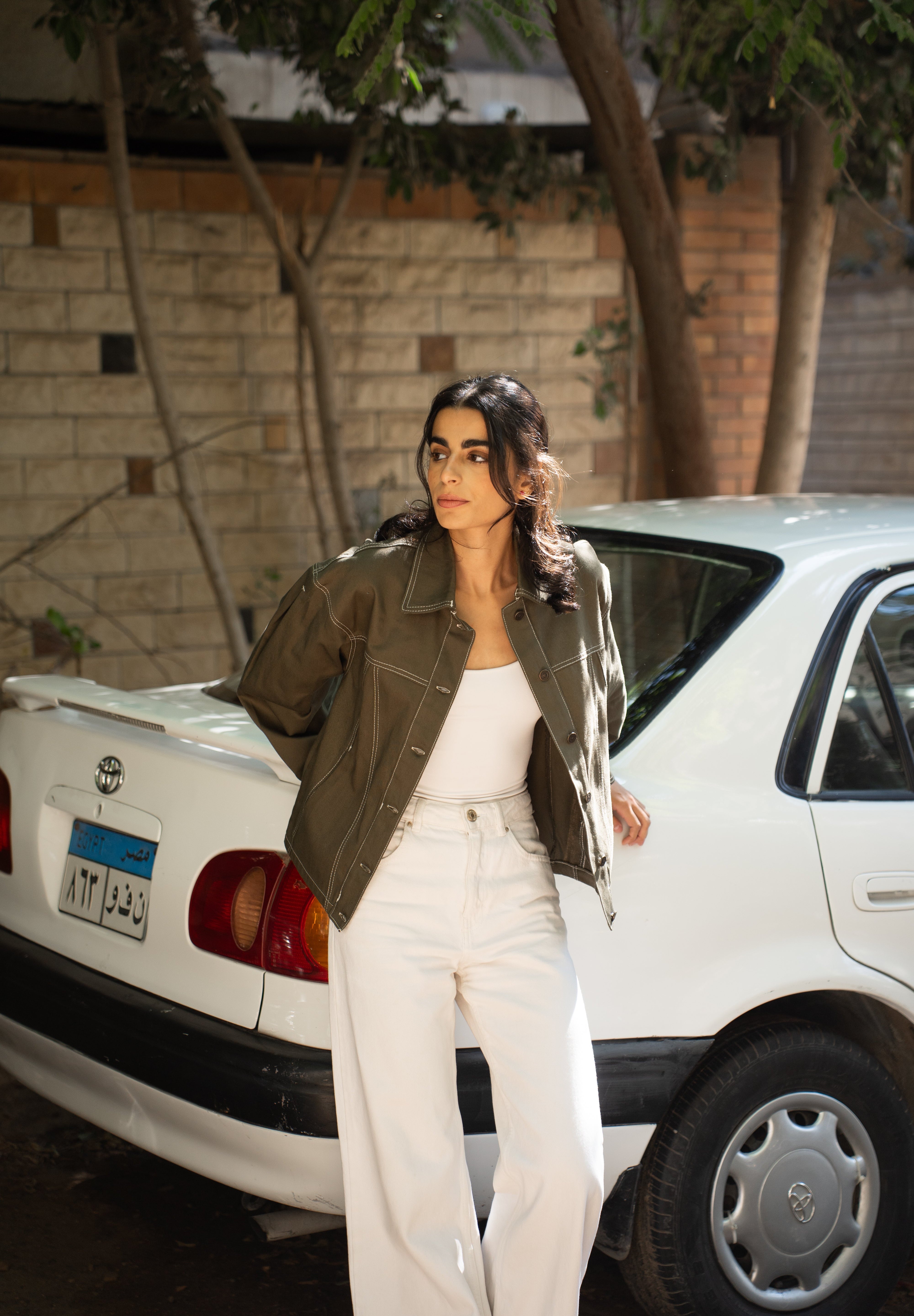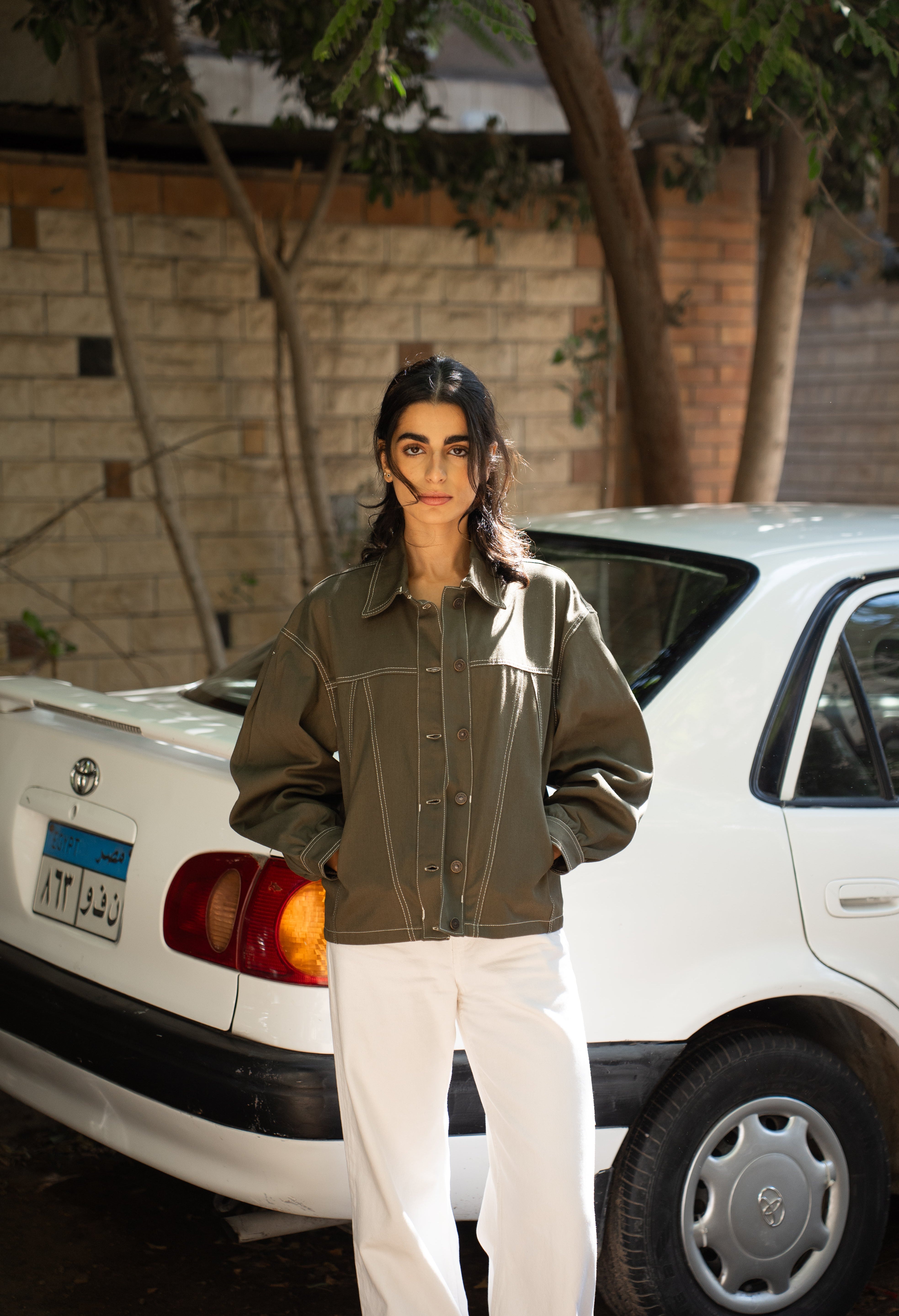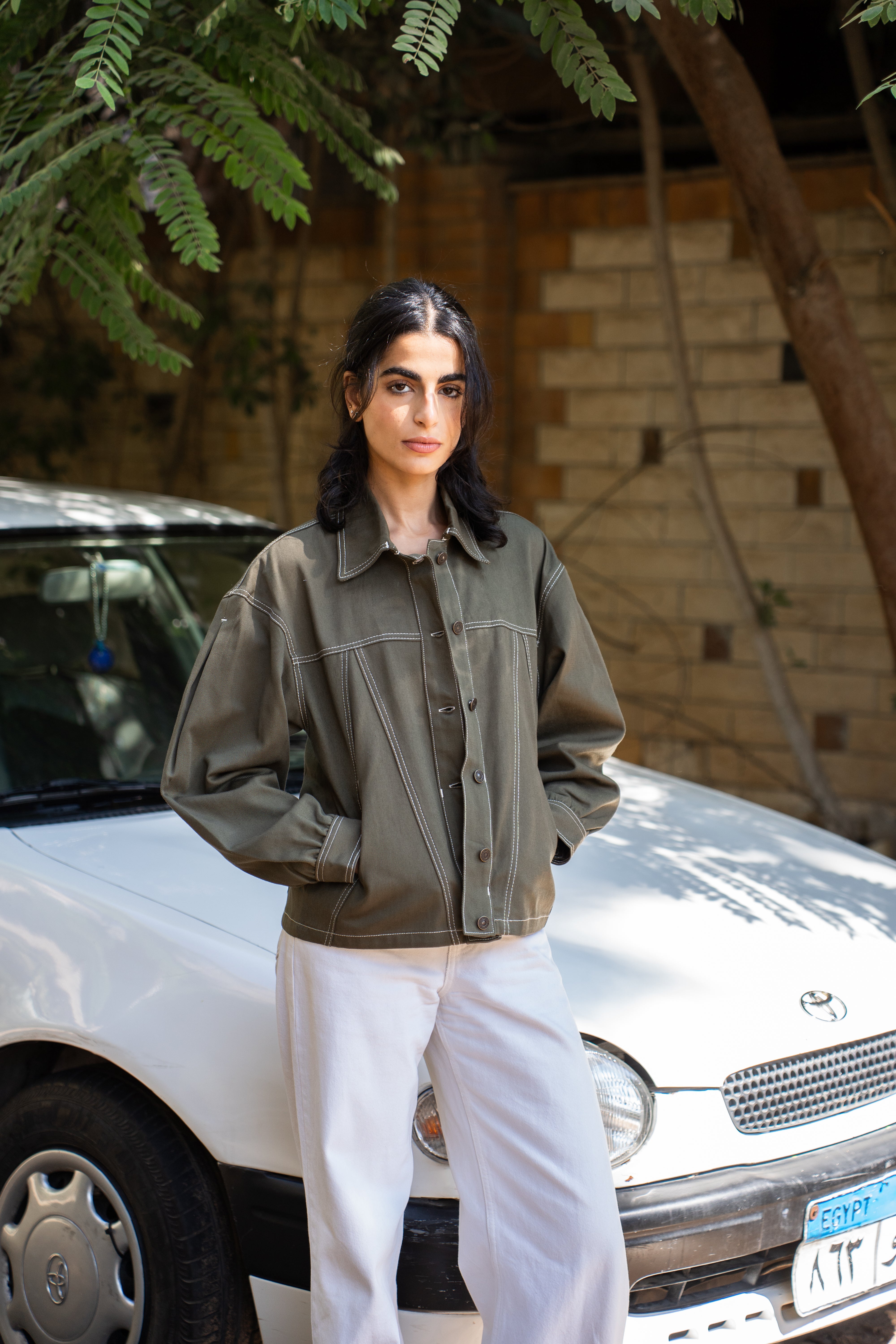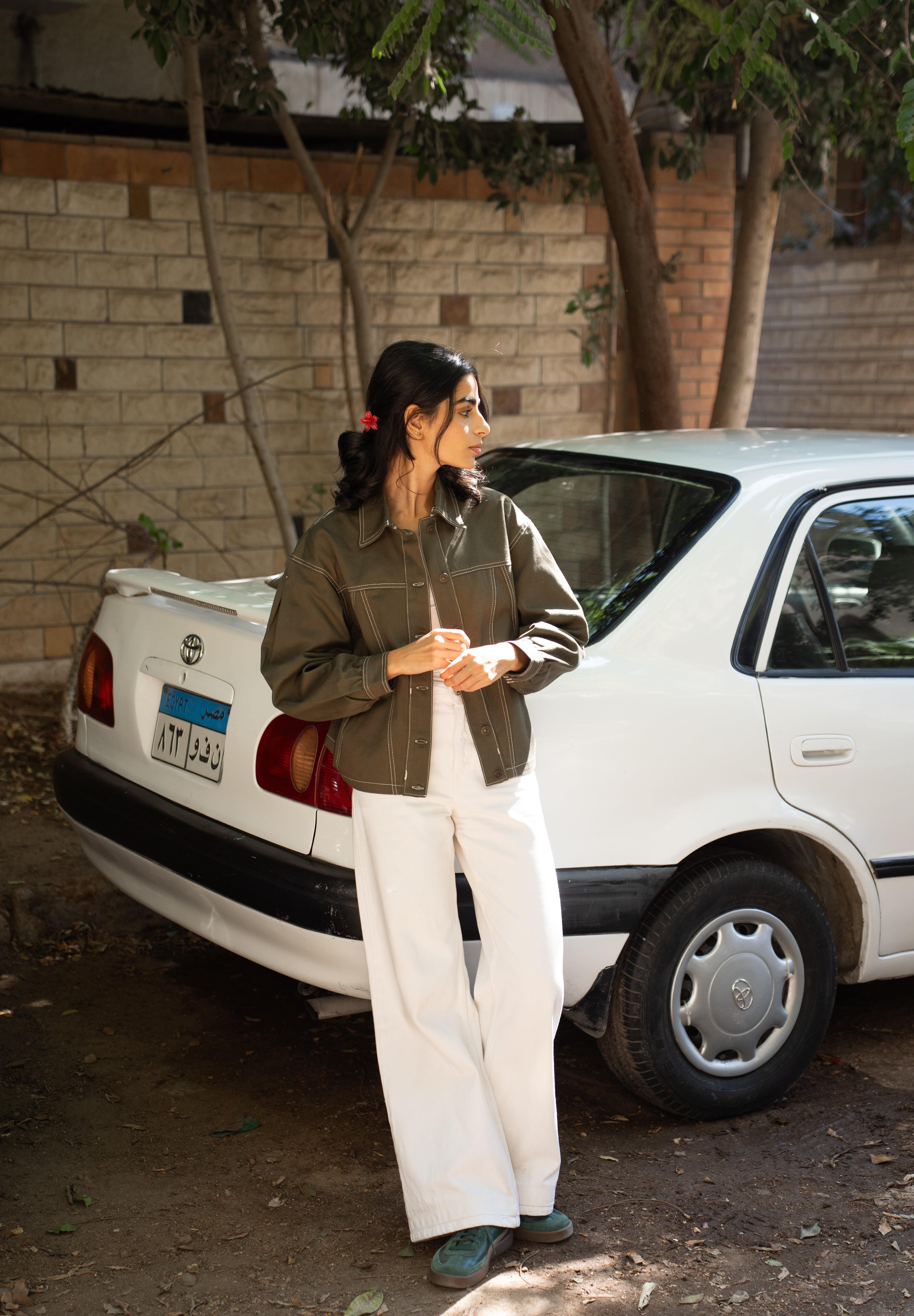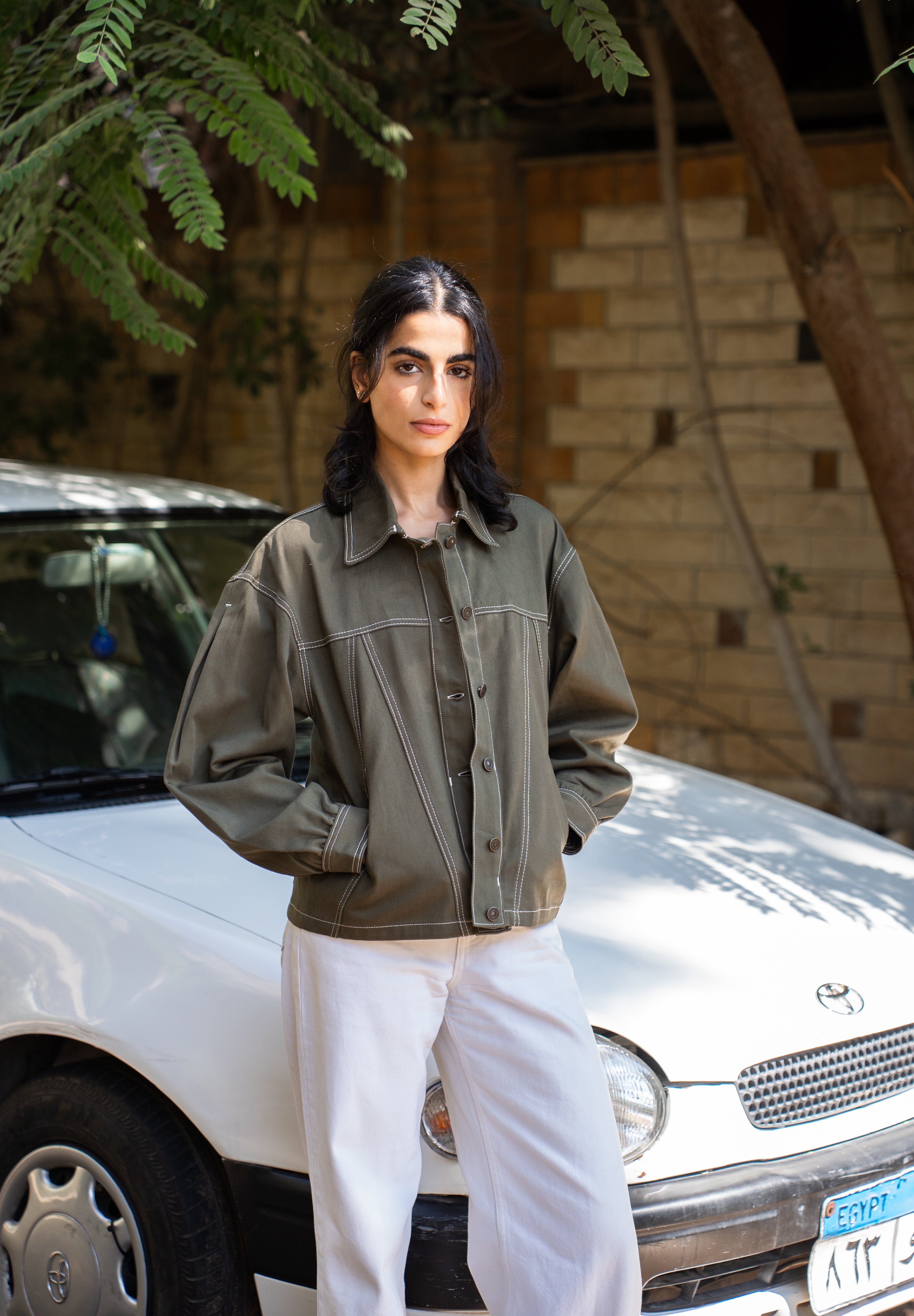 Made from upcycled gabardine, each piece is ethically crafted in Egypt by local artisans who transform surplus fabric into wearable art. The jacket’s crisp texture and natural drape reflect the balance between structure and ease, ideal for layering as temperatures fall.