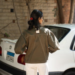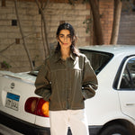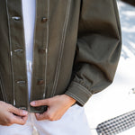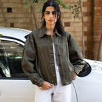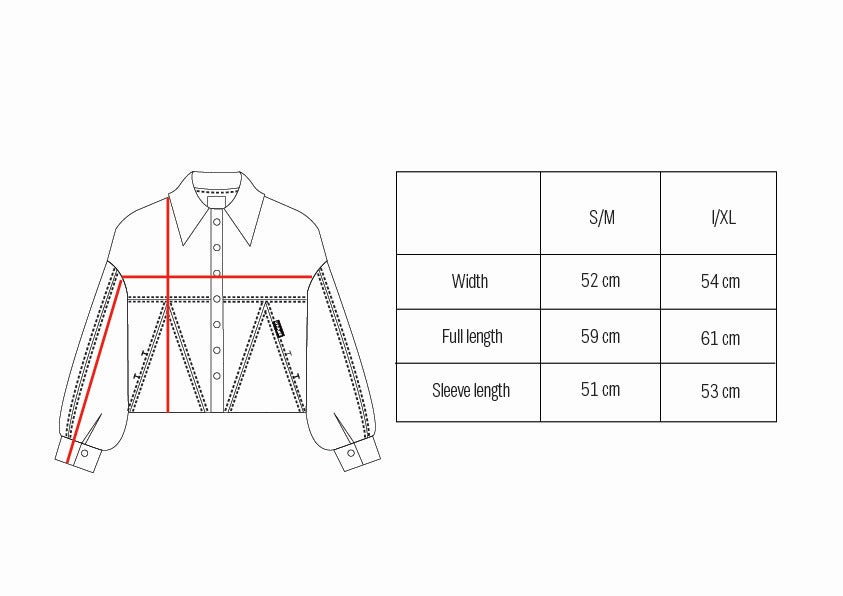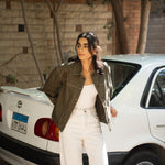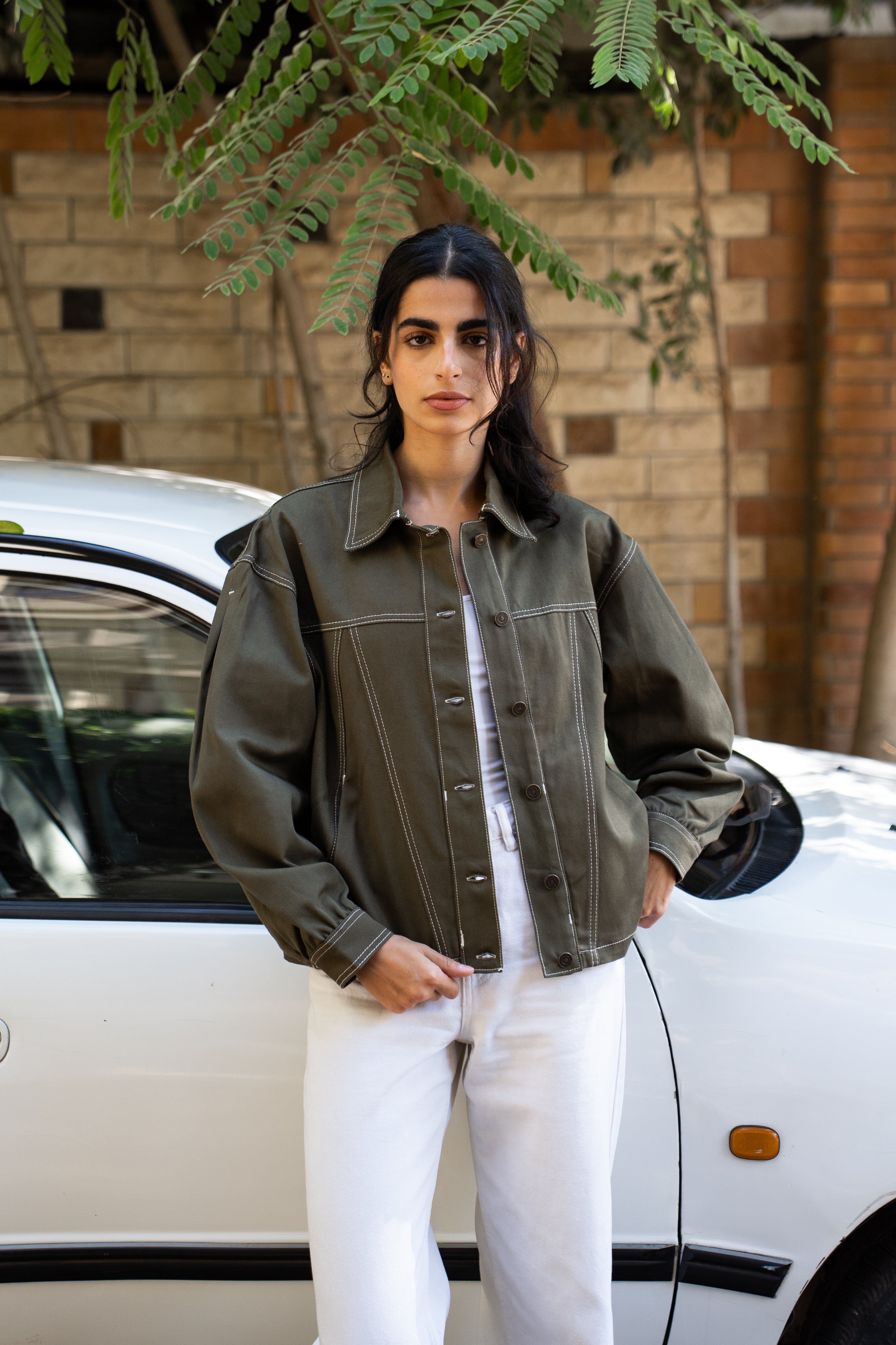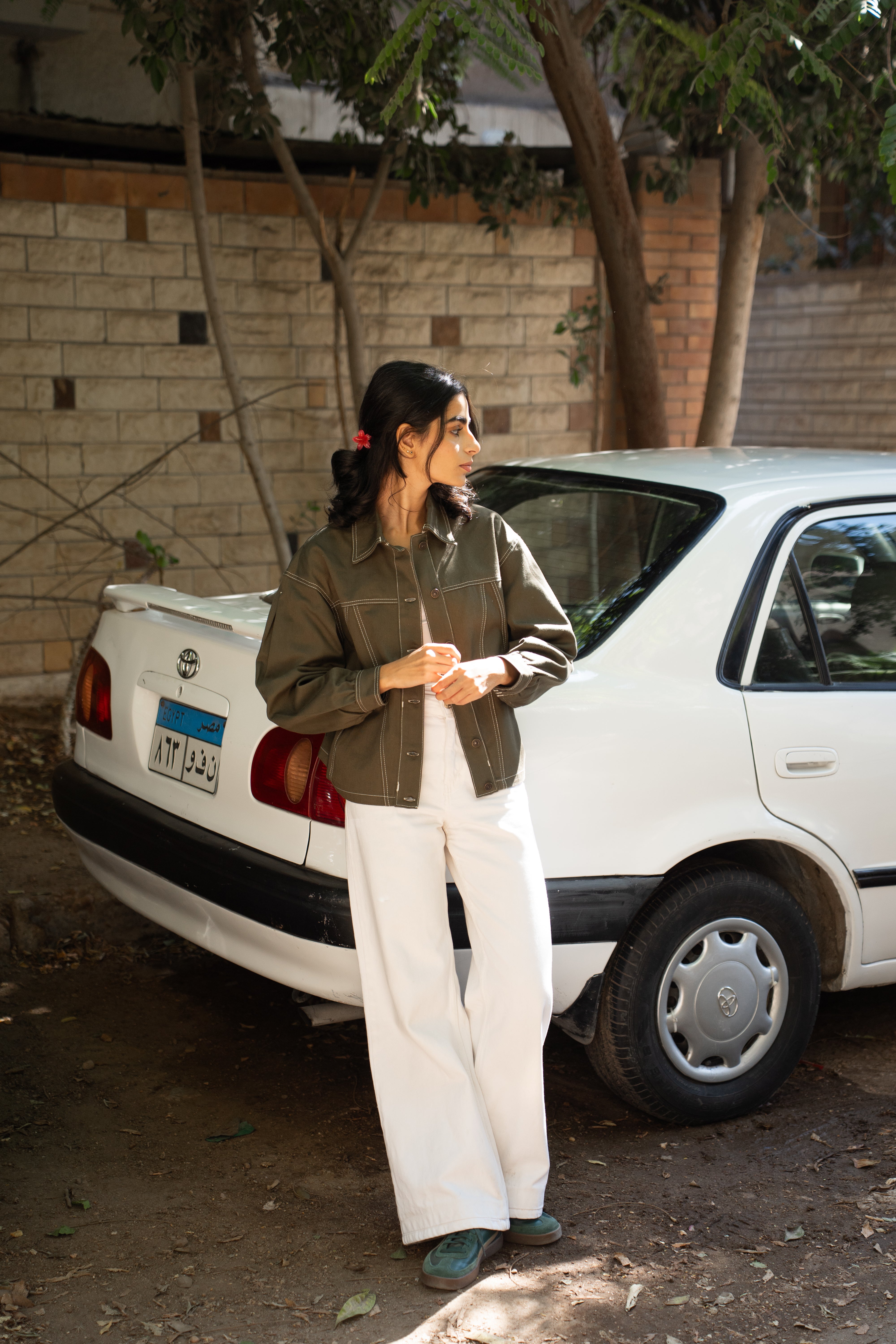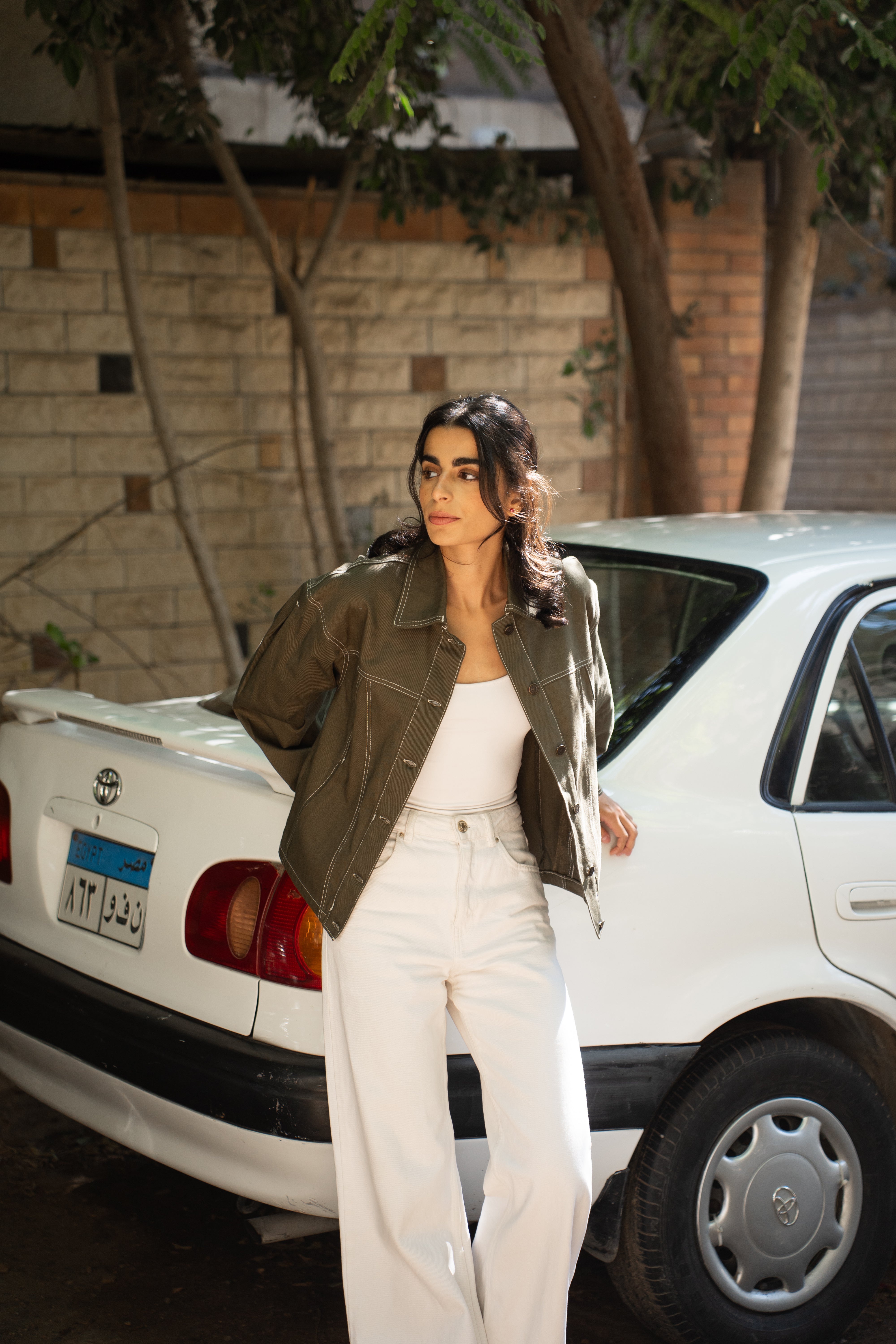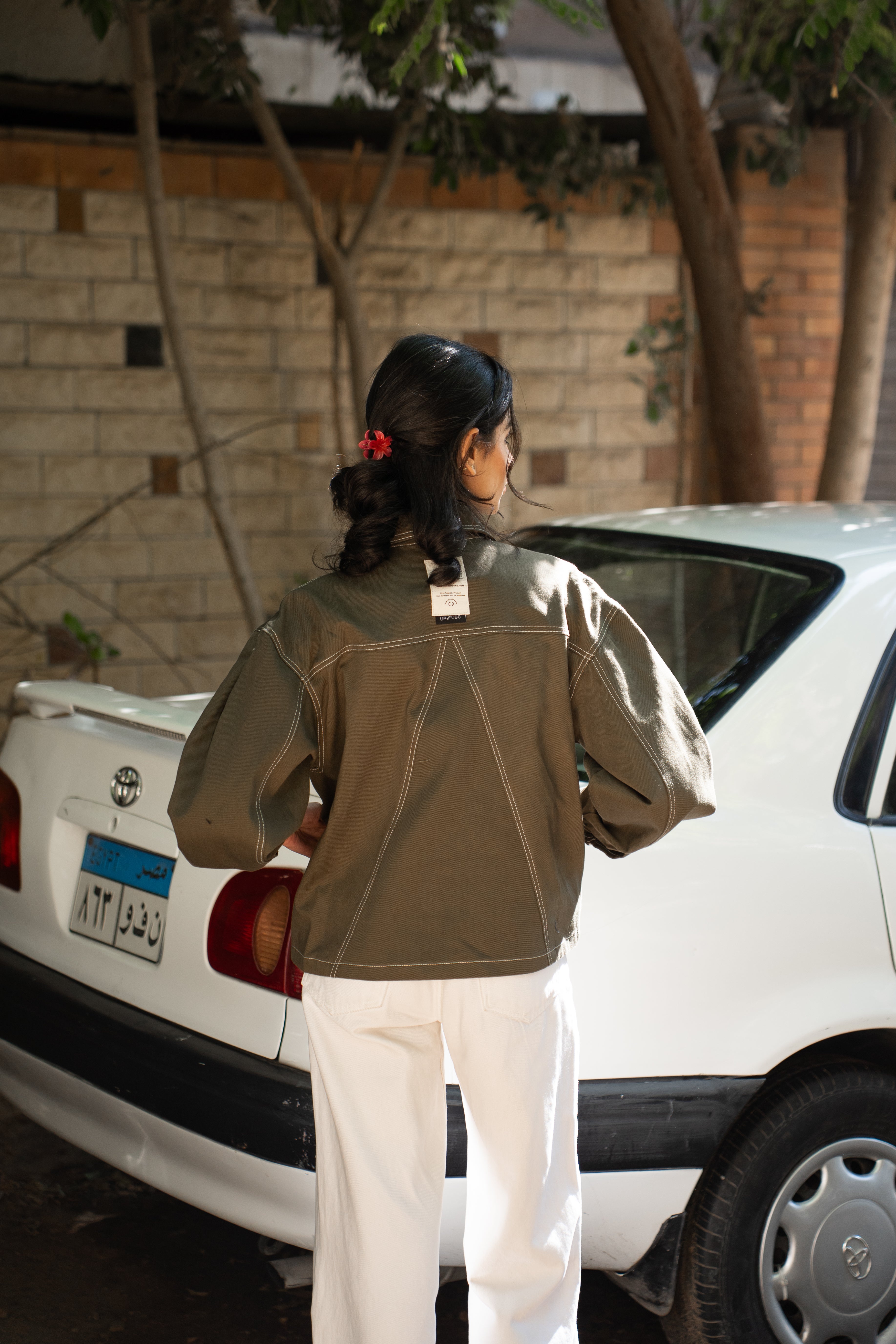 Made from upcycled gabardine, each piece is ethically crafted in Egypt by local artisans who transform surplus fabric into wearable art. The jacket’s crisp texture and natural drape reflect the balance between structure and ease, ideal for layering as temperatures fall.